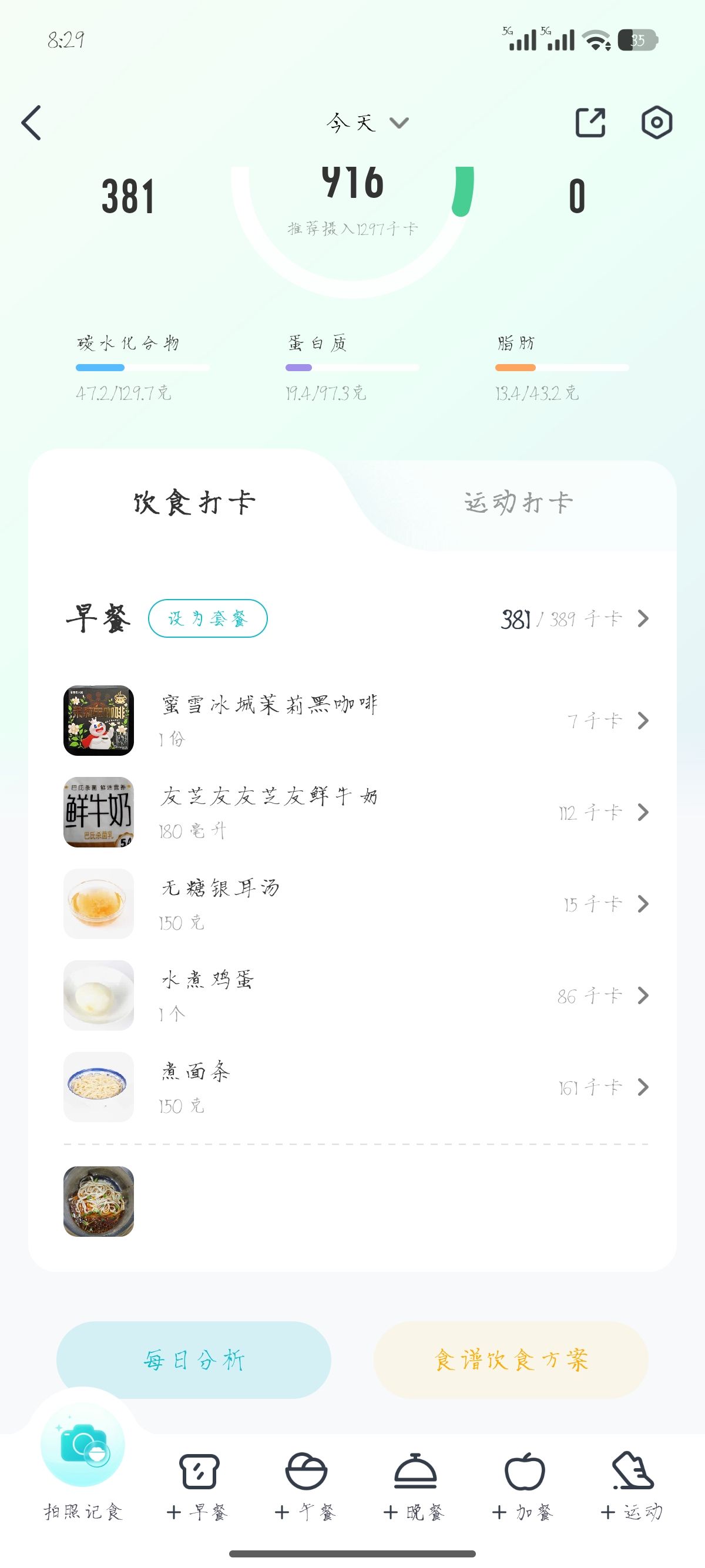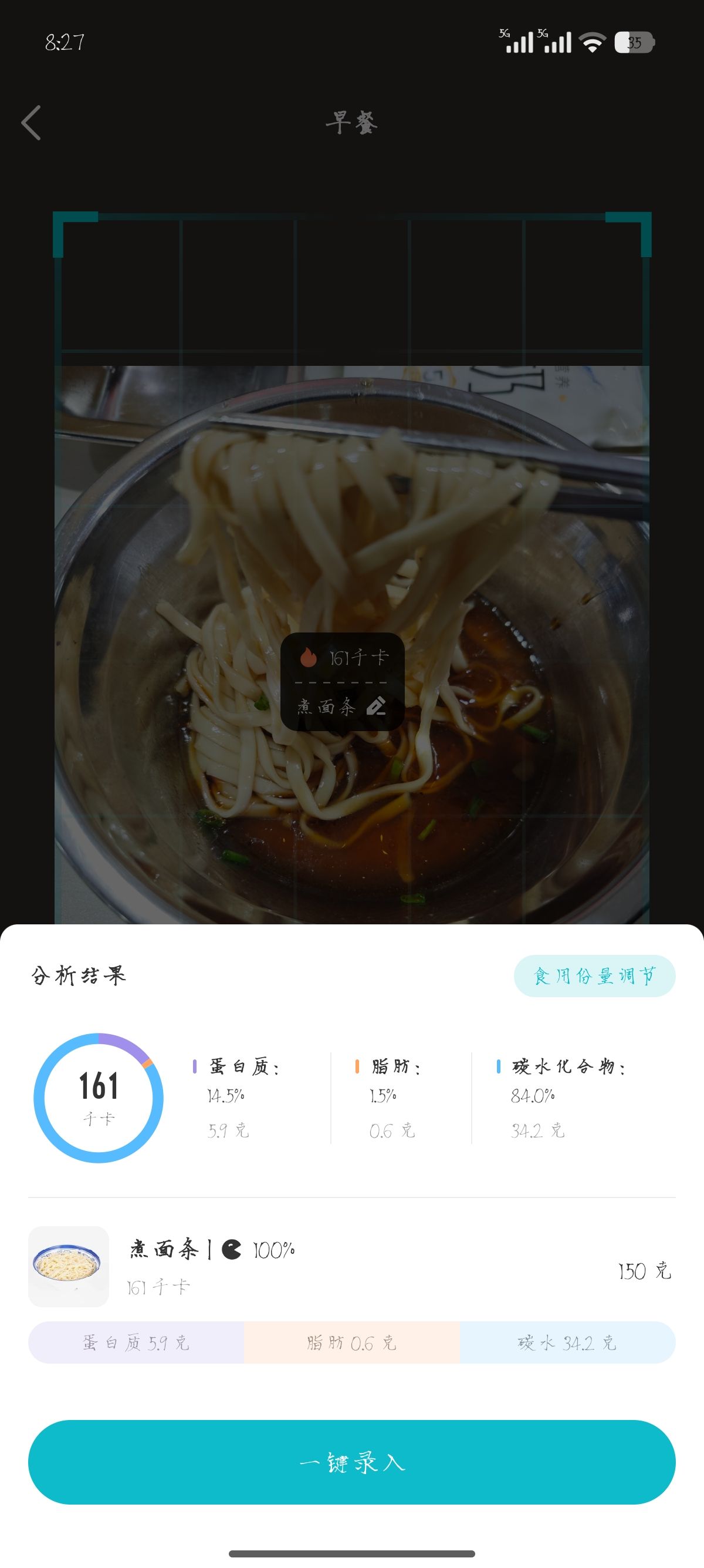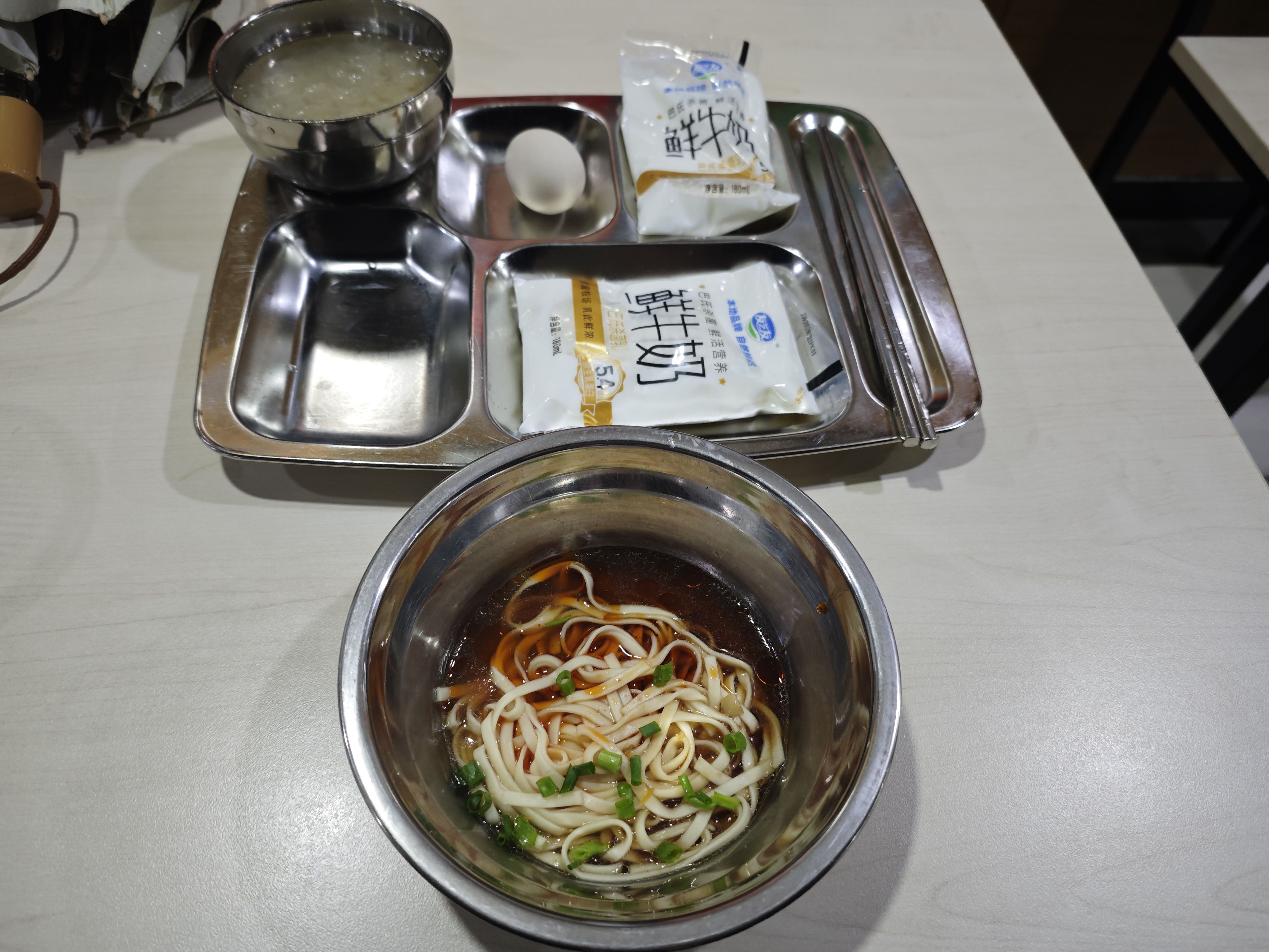 让食堂师傅少下点面,就真只有一口😳。拍照识别150g热量160大卡,这不对吧?这顿早餐吃完都没什么感觉,这就380大卡了?哦霍,看来我要饿到中午了。