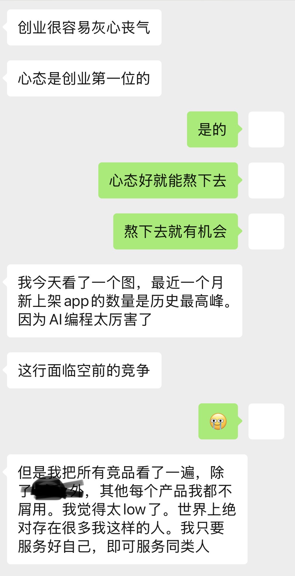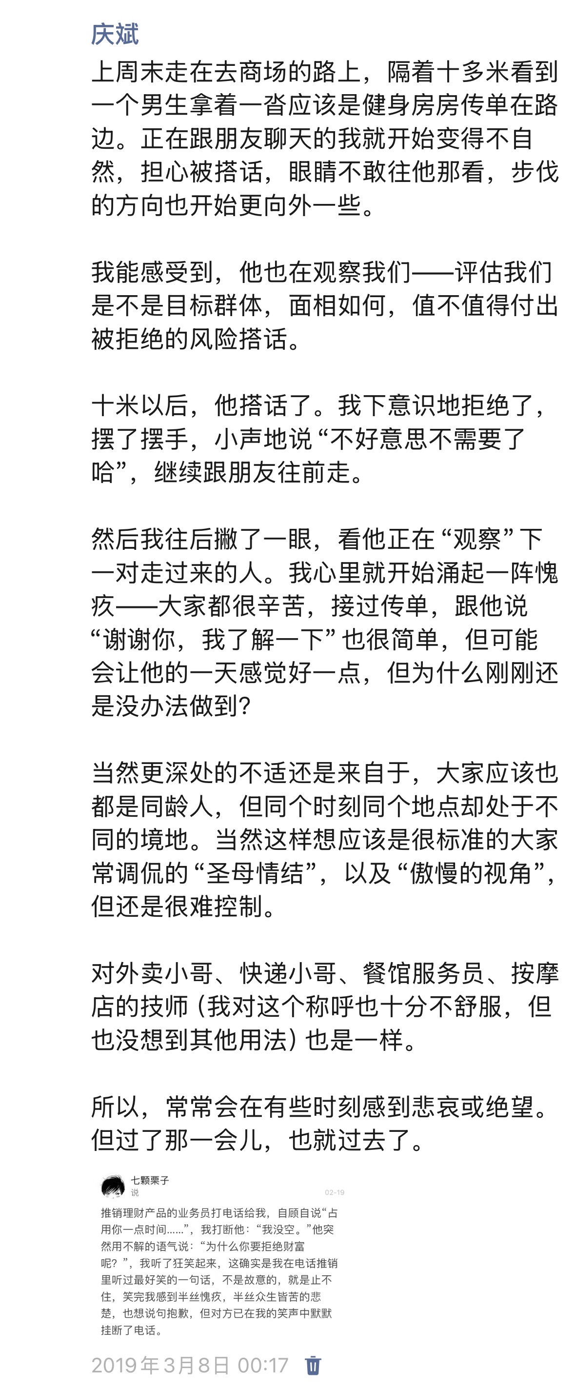 前面是跟咨询师聊到内心深处的「等级感」。就虽然日常会用政治正确和理性约束自己,说大家都是一样的,但心里仍会觉得职业有高低贵贱生活方式有好有坏,看到基层服务人员会有一种居高临下的怜悯,觉得大家很辛苦。我也很讨厌这个或显性或隐性给人分出三六九等的世界和人,我感到难过和愤怒。