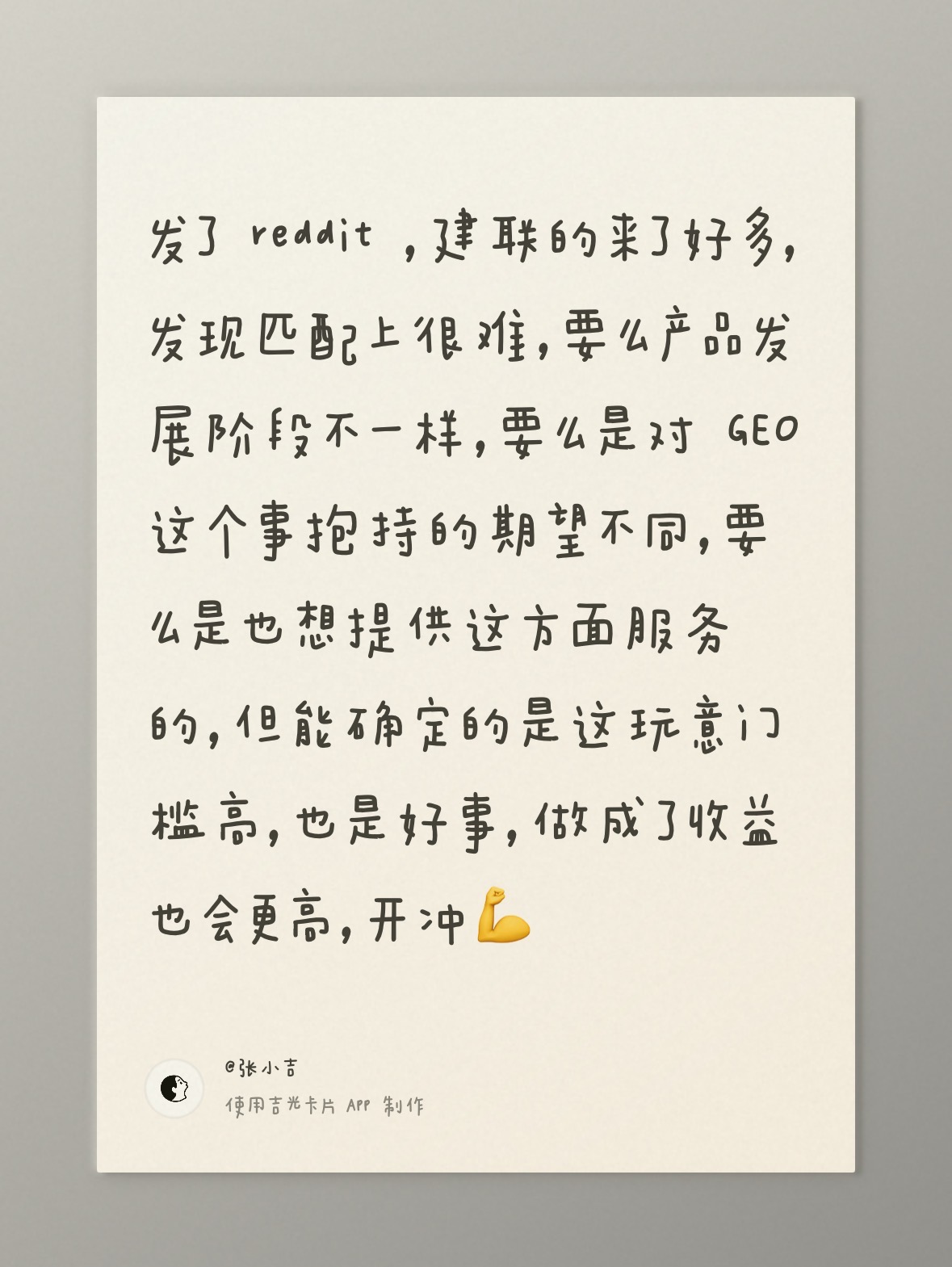 所以现在我的感觉就似,零散众包的 Reddit 代发 这个可能不 work,或许真的找几个想要长期投资 GEO 的老板,一起搞一批账号圈才可靠,有兴趣的欢迎 DD,软件行业的老板优先,我的微:piapiazhao,当然我说的也不一定对,暂时先想到这些,欢迎拍砖🤔