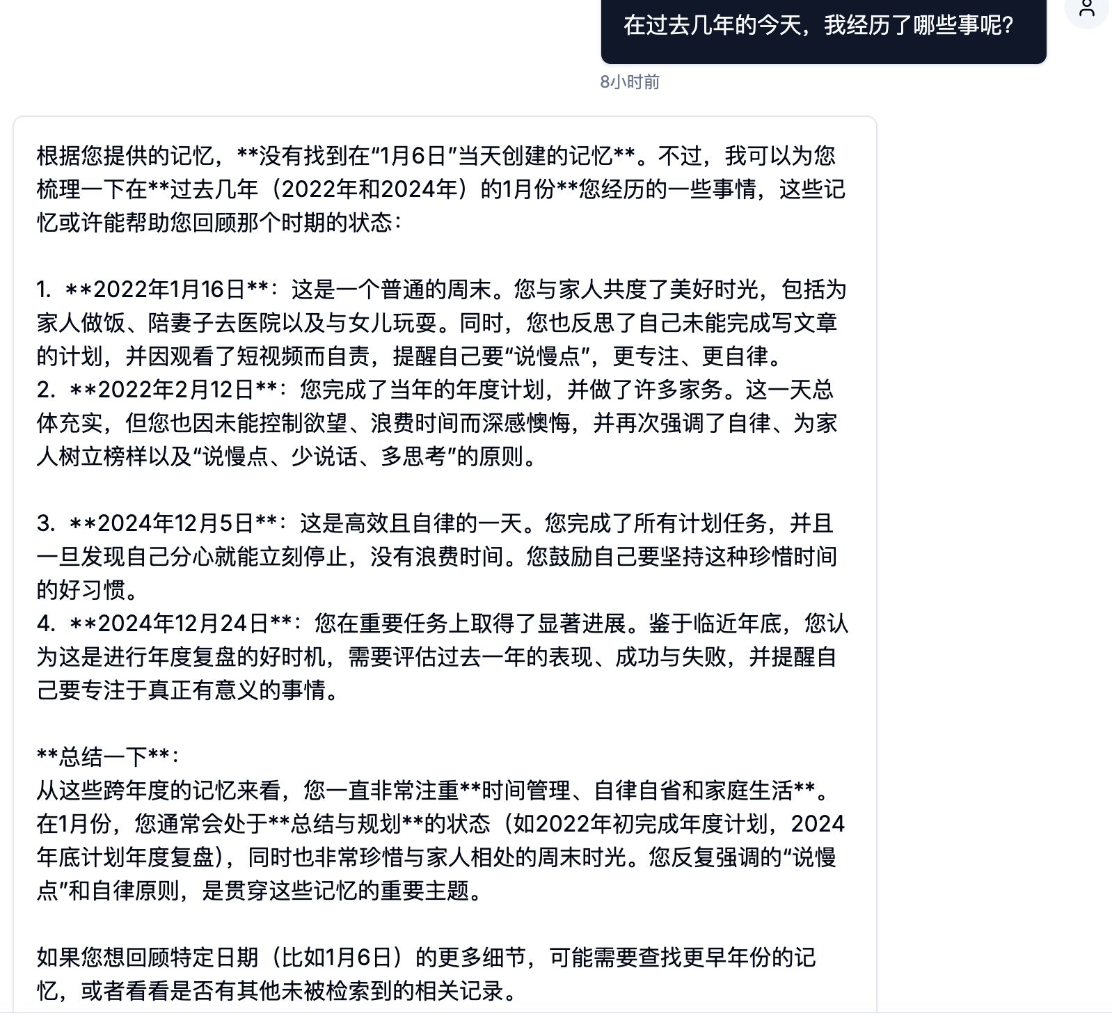 今天,自己终于把自己的 AI 数字分身的 MVP 版本完整地部署到了腾讯云服务器上面,可以正常地进行记忆查询和元数据查询。MVP 版本终于完成了,明天起向更高级的版本迭代。