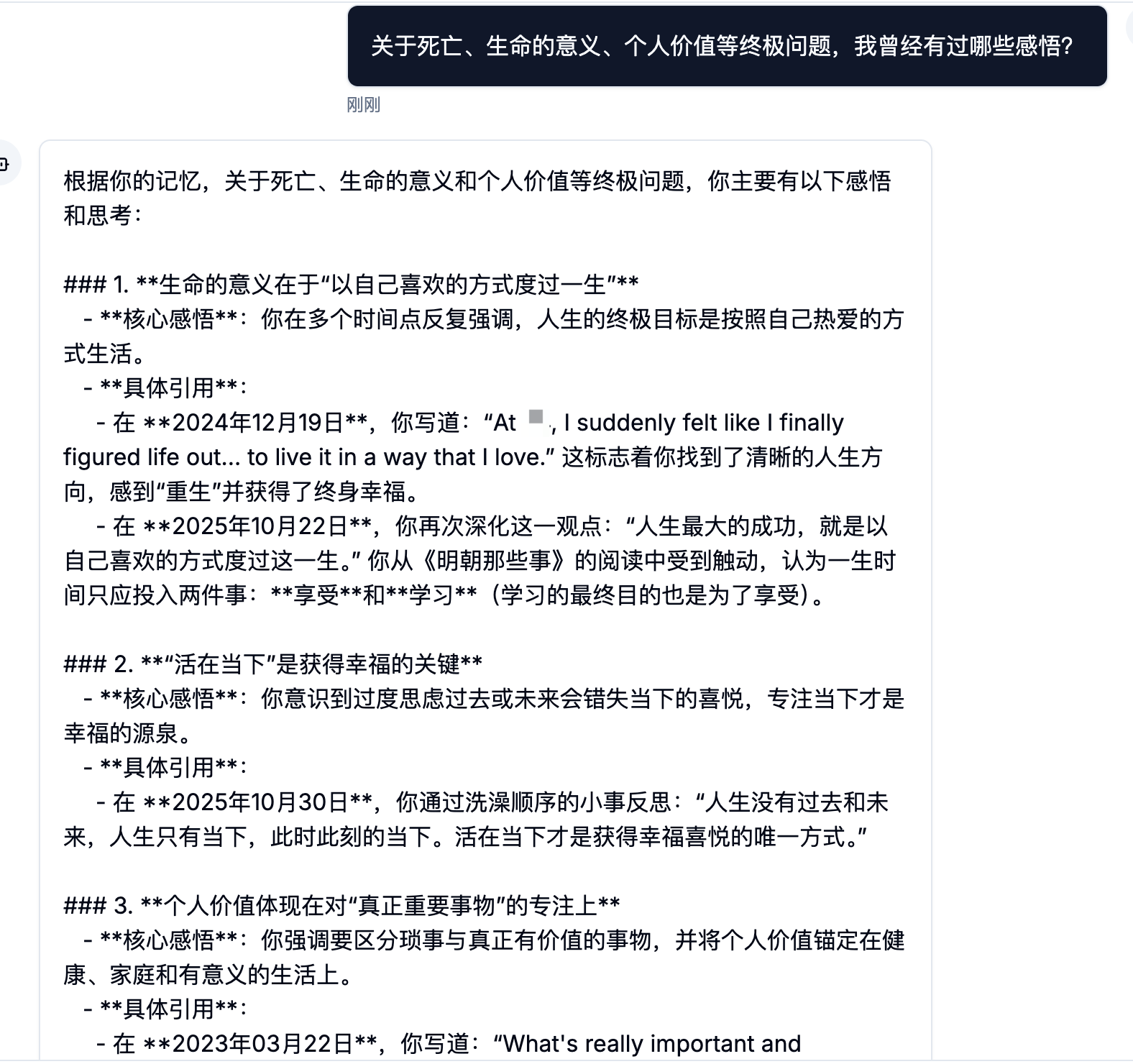 最近我根据过去几年自己 2000 条日记,开始完全从零开始构建自己的数字分身,这两天MVP版本正式跑通了,运行效果还不错,期待后面更丰富的功能实现: