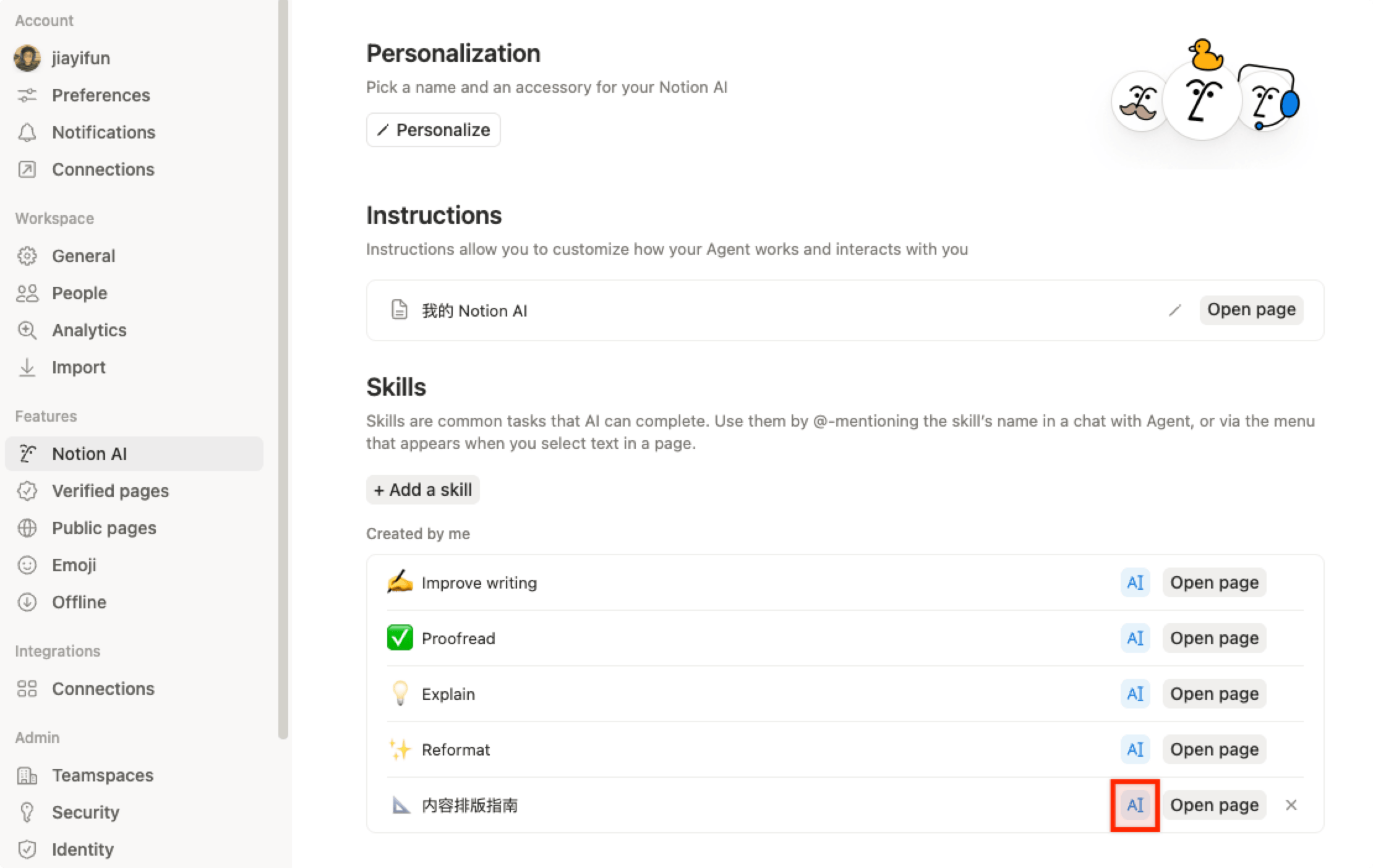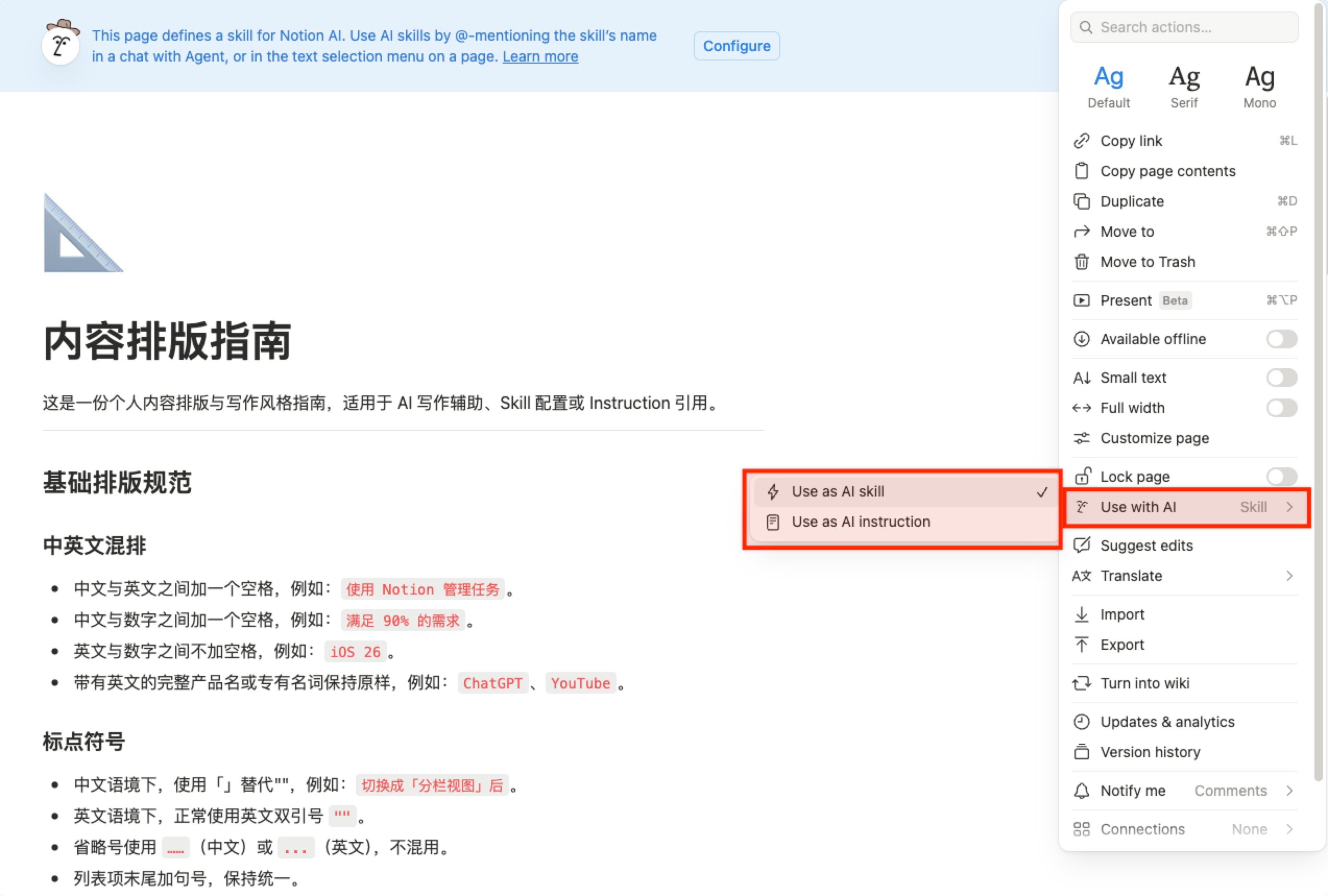 发现一个 Notion 新功能:Page 可以设成 AI Skill 了。