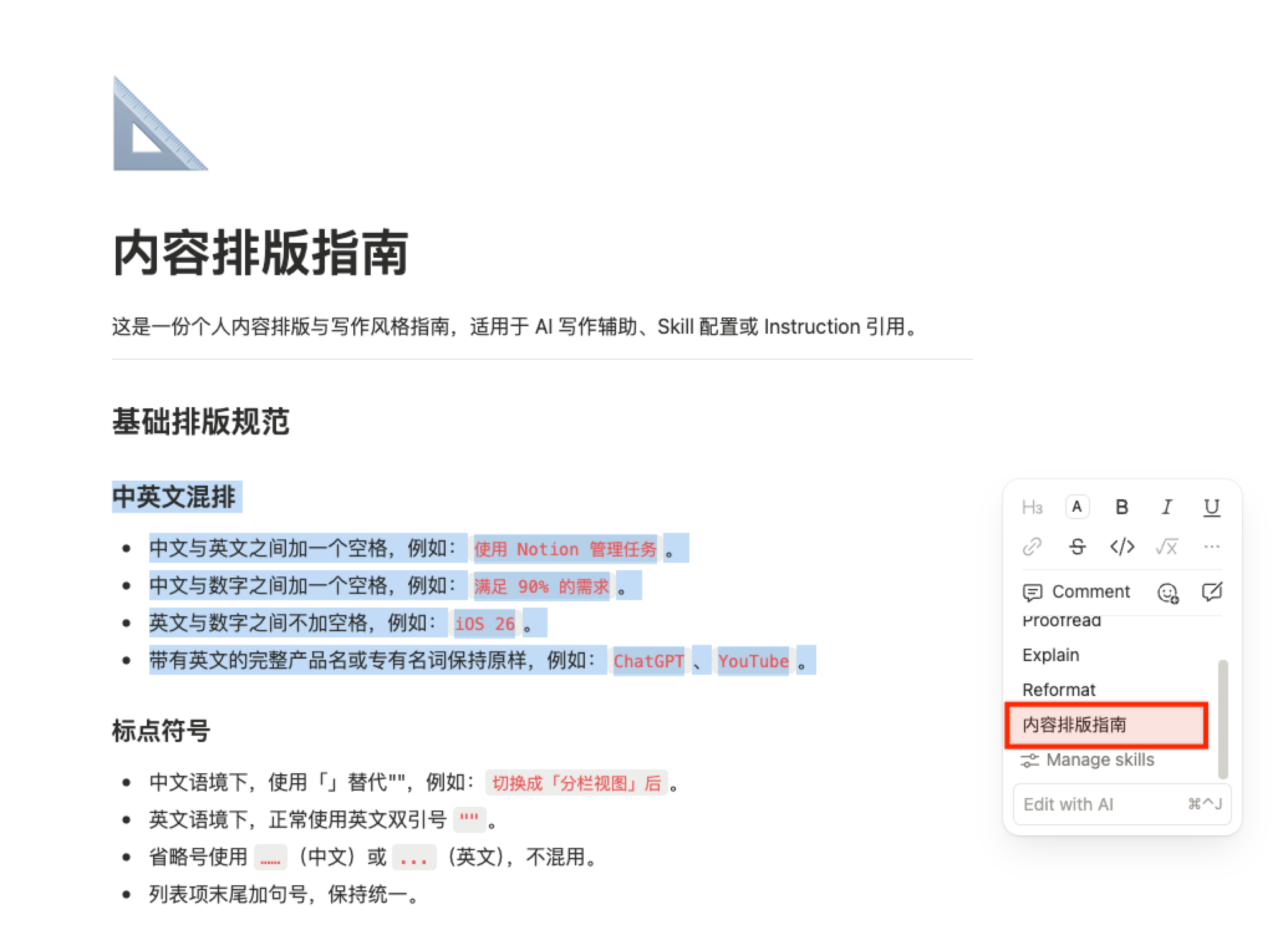 比如把「内容排版指南」设成了 Skill,选中一段文字,点一下 Skill,就会按照定义的排版规范来优化这段文字。