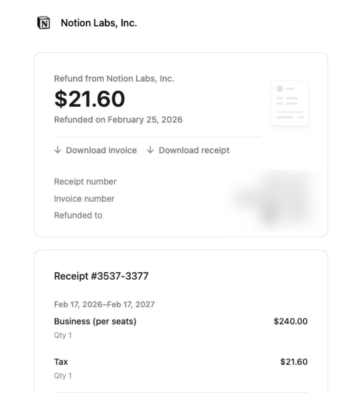 上周订阅 Notion Business 年度会员时,结算地区跟着代理默认选择了新加坡,结果被多收了 💲21.6 的税。