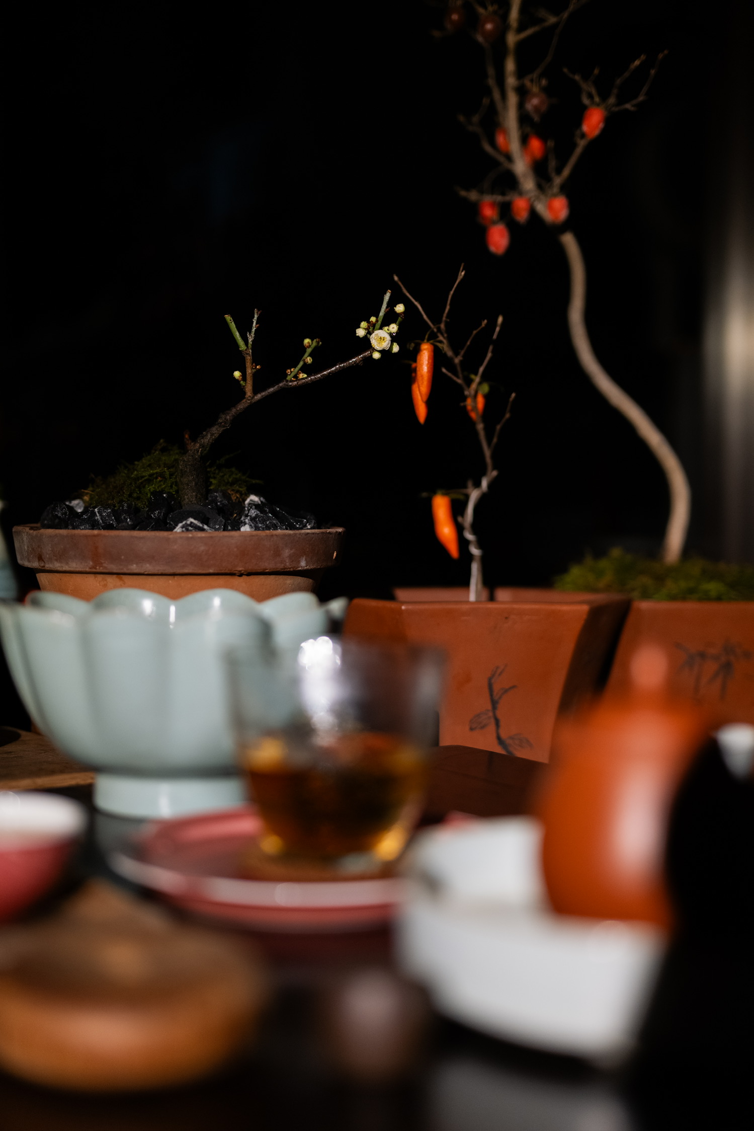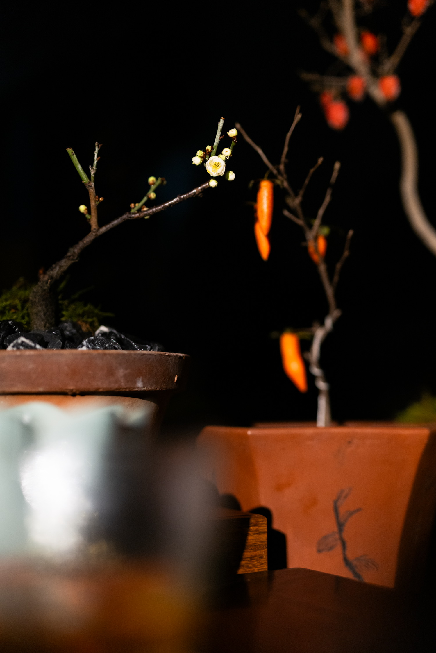 枯枝凝柿色,素盏卧茶烟。