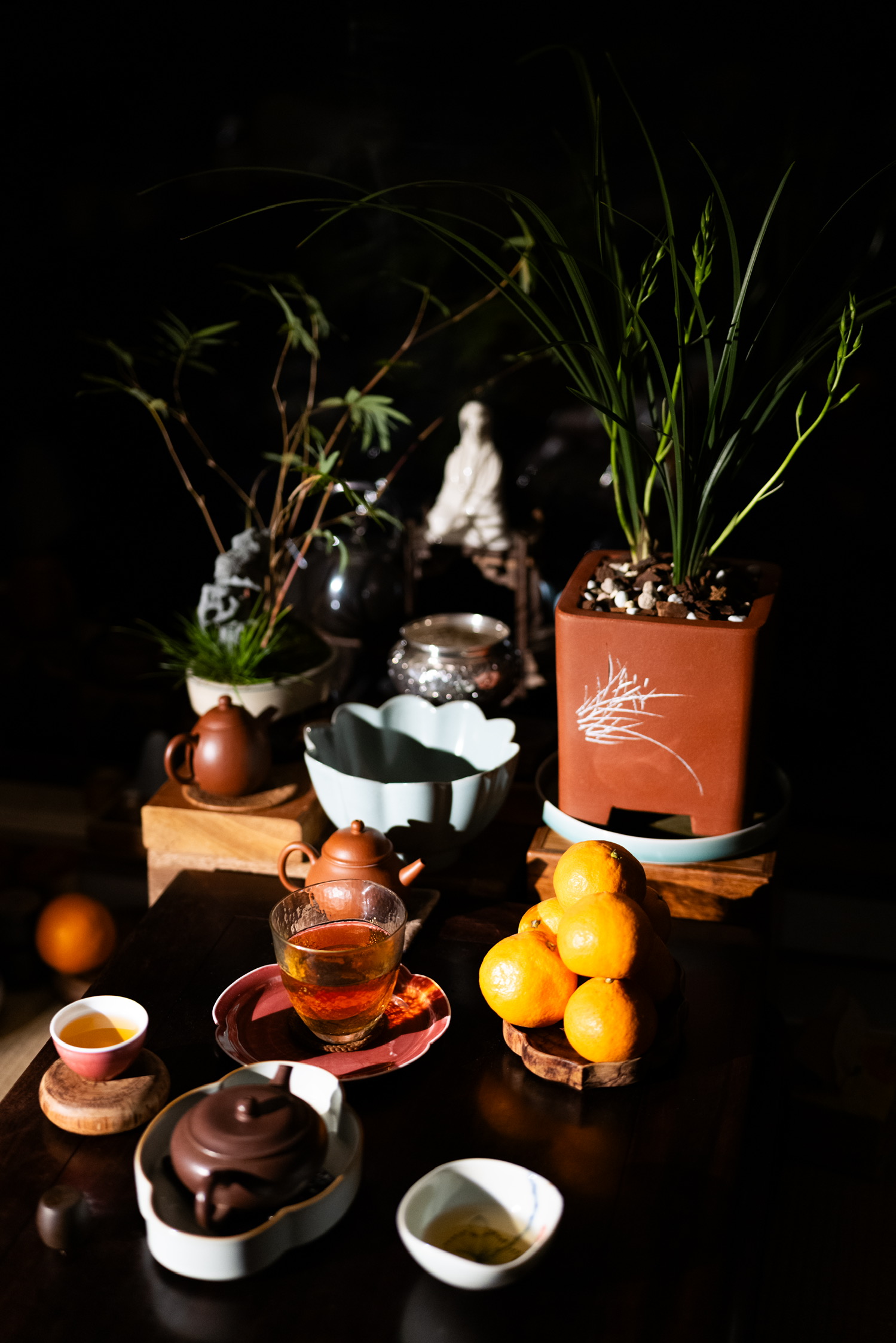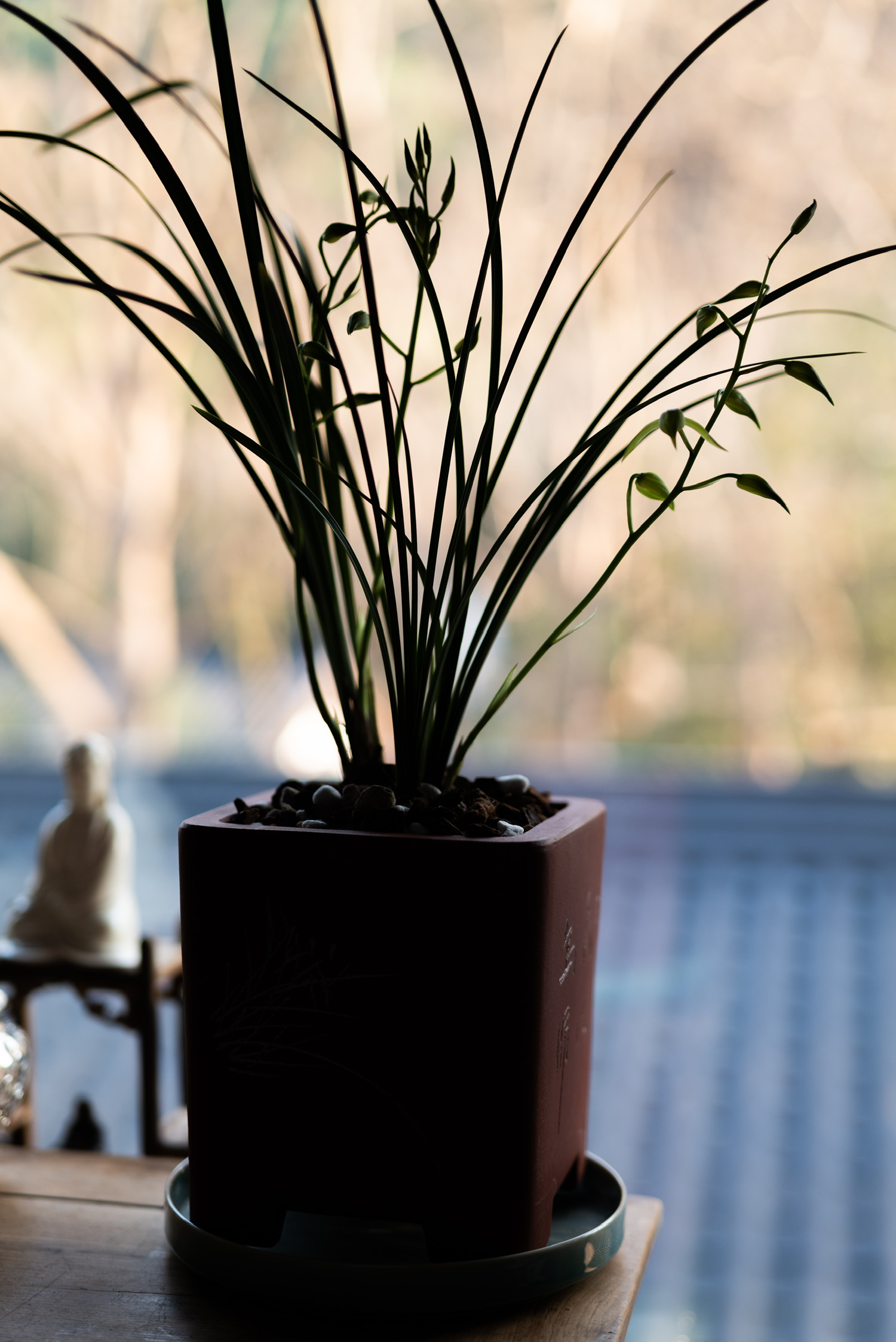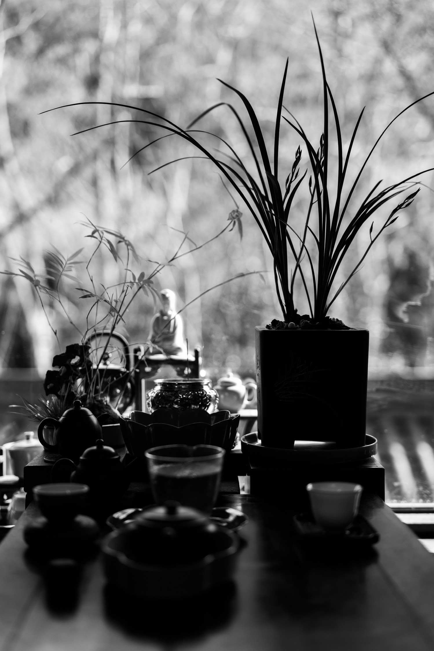 兰影疏窗意自闲,茶烟轻袅入空山。