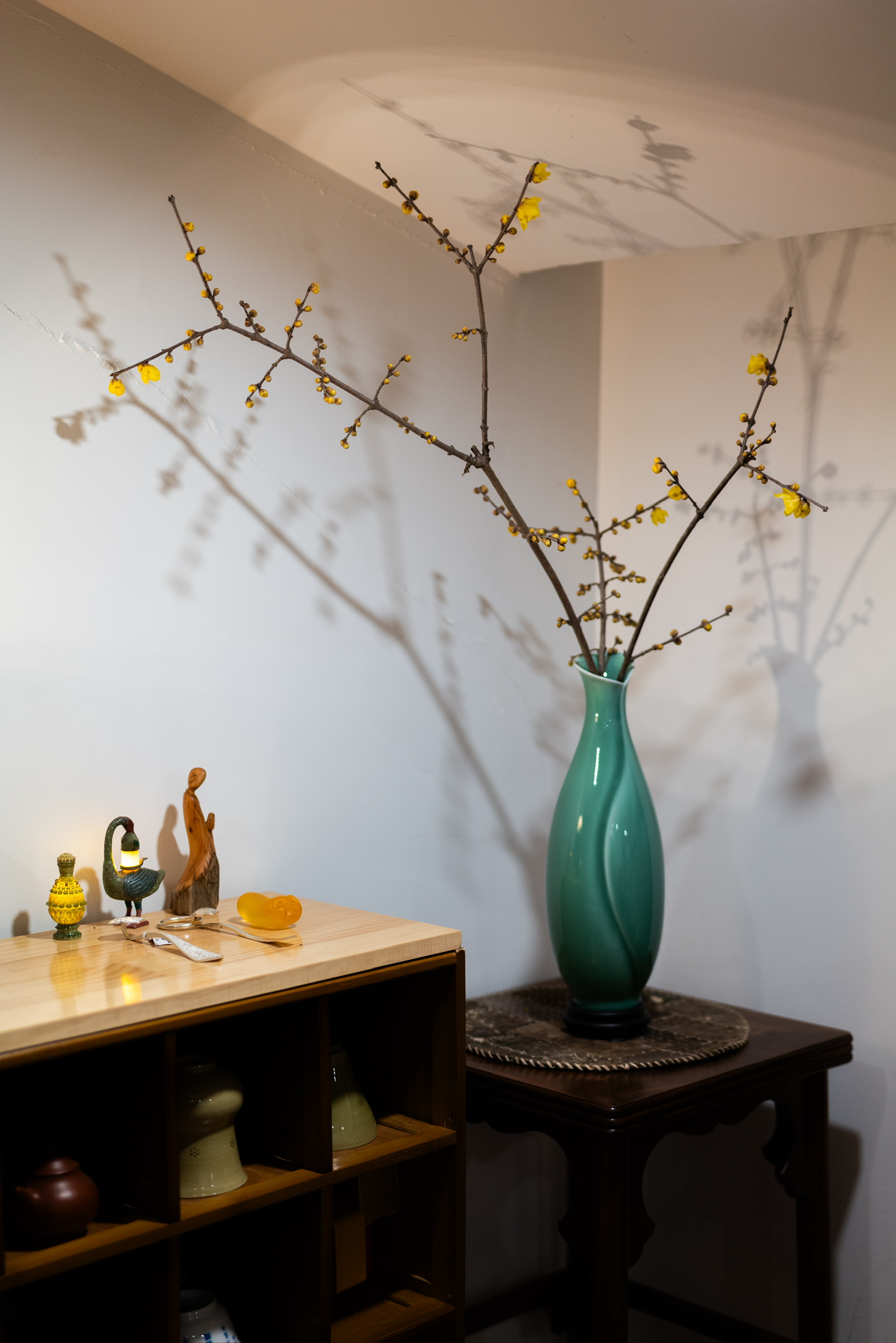 寒枝斜影落堂隅,一缕幽香破寂无。