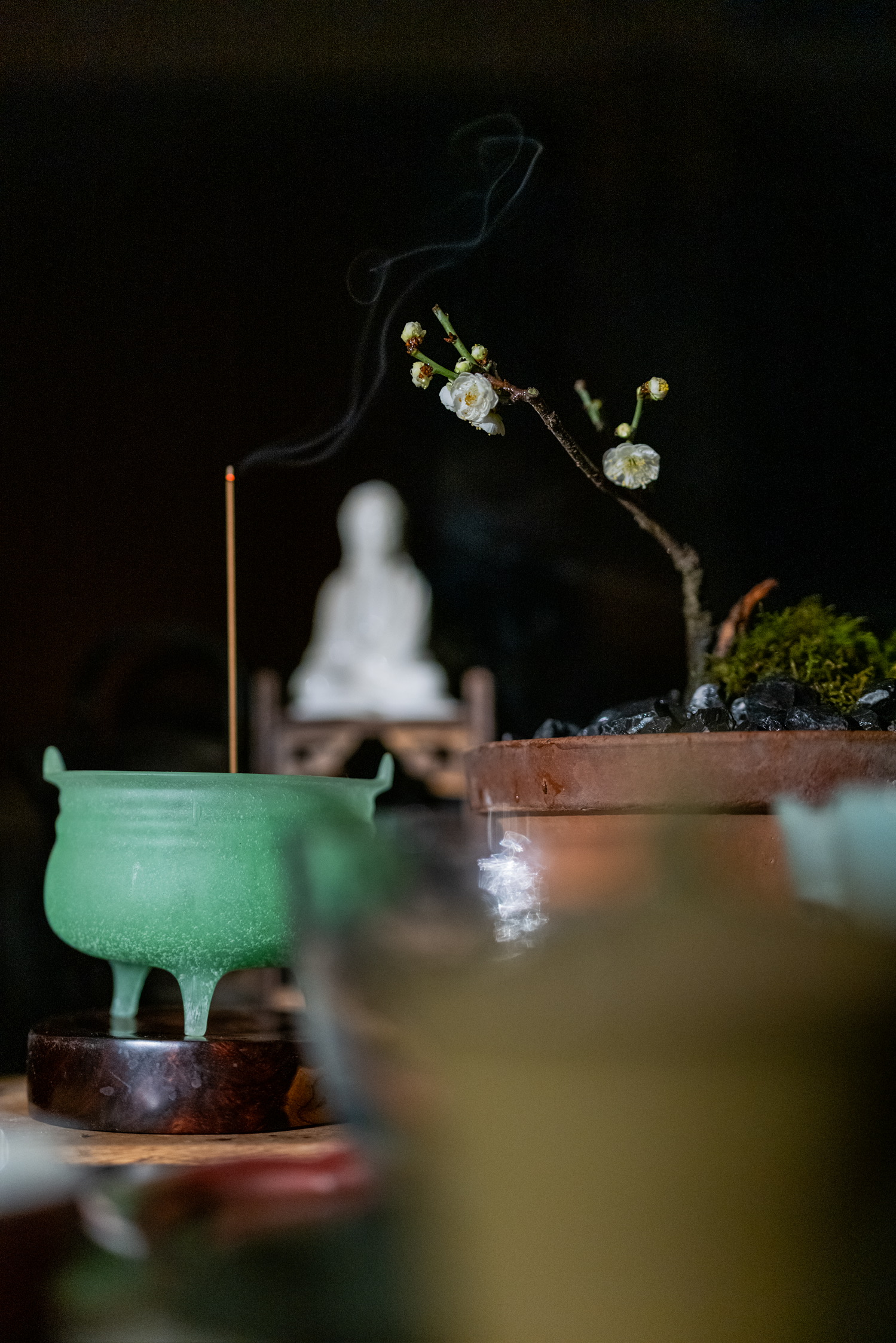 一柱檀烟绕案浮,寒梅疏影伴禅庐。