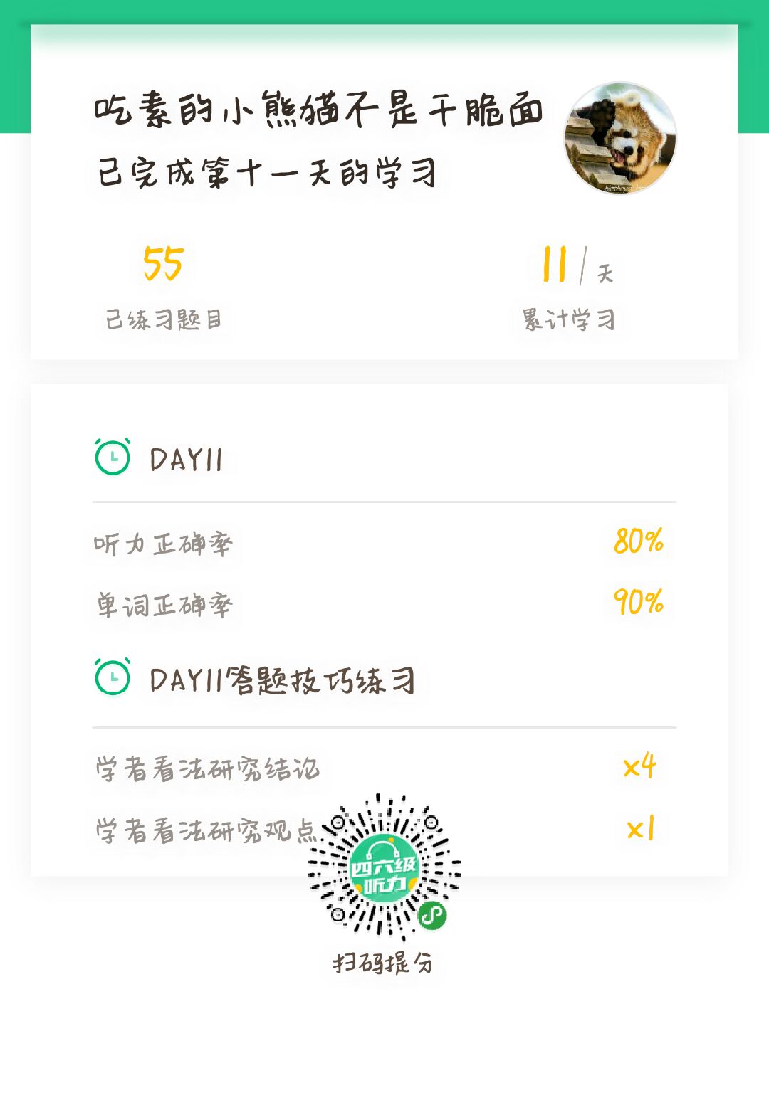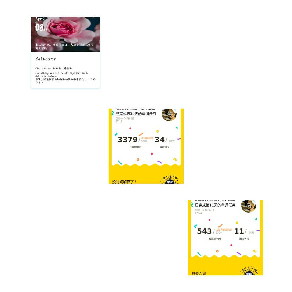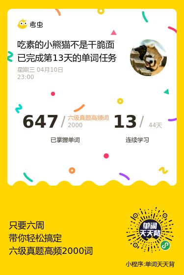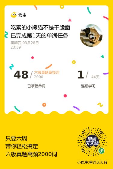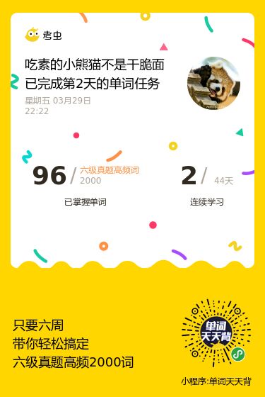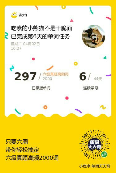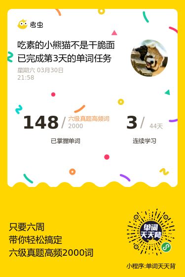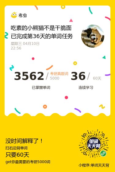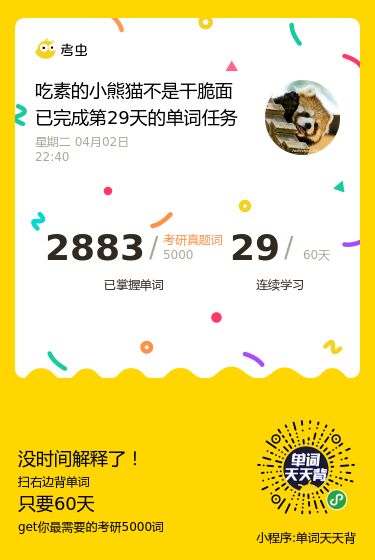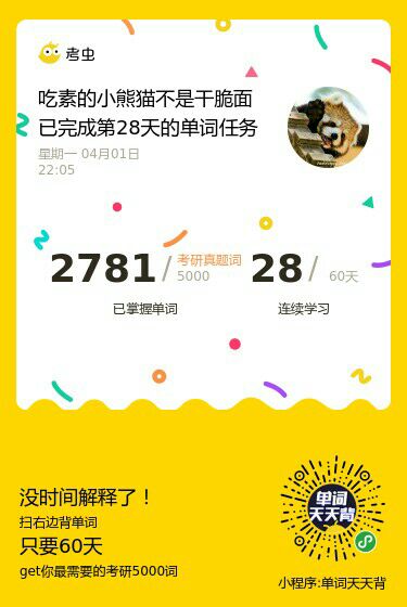 单词已经背了30天啦,没想到自己坚持了一个月了。这几天的感受就是单词背到中后期(指我用背单词的小程序,5500的那个)我拿不准的词汇有点多了。我不知道是不是都这样,也不知道是好是乖,但我感觉还不错,有了不会的才会有进步,嘻嘻