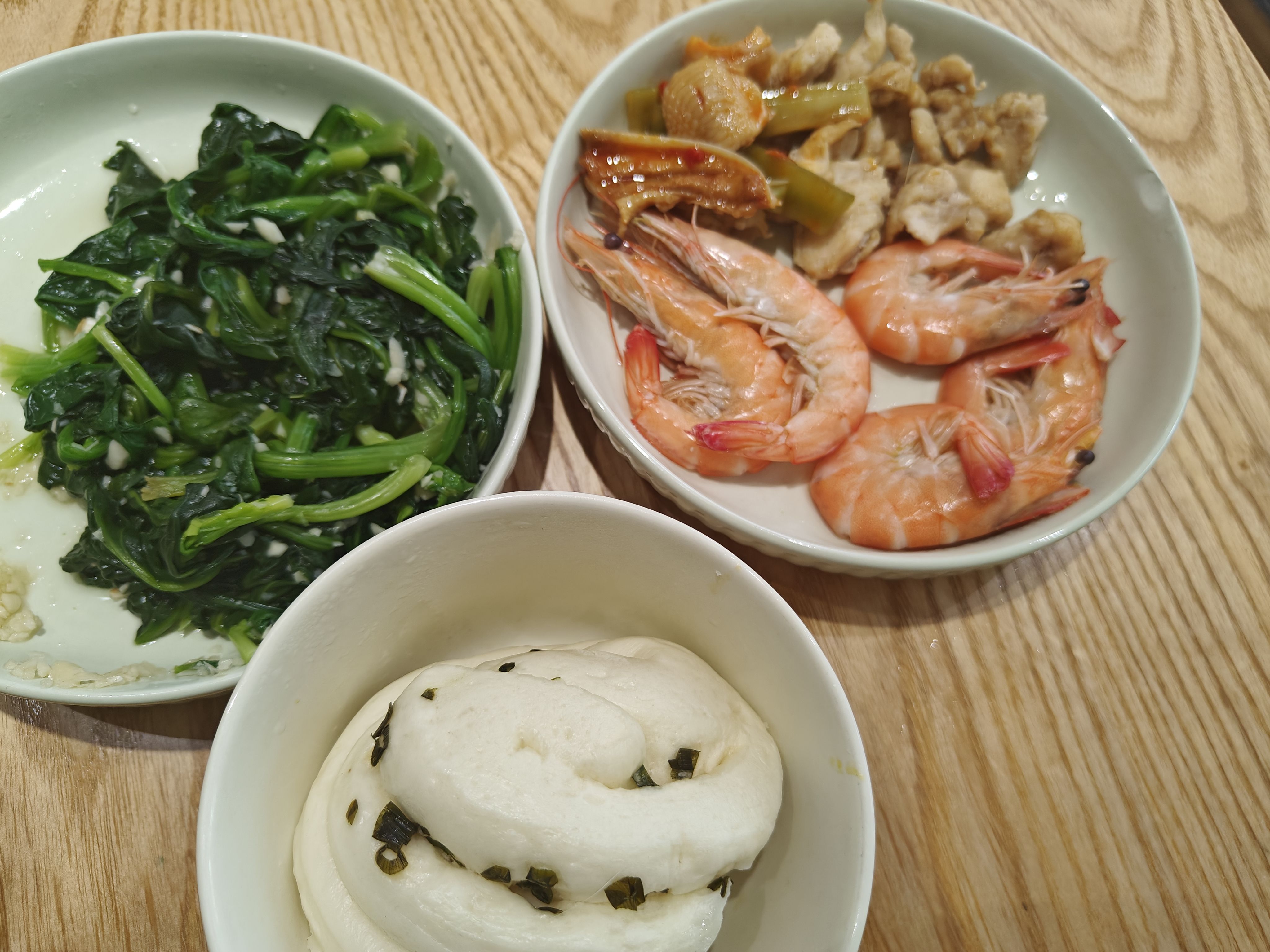 凉拌菠菜,烤鸡胸肉,盐水煮虾,花卷。