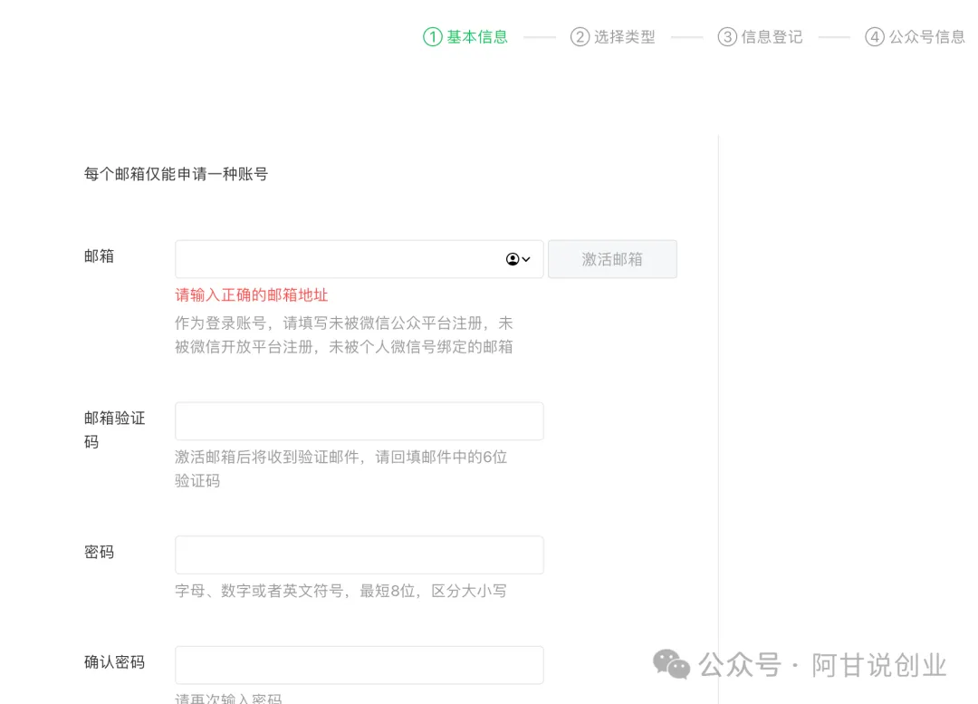 这里需要注意的是,一个邮箱仅能申请一种账号,如果是企业号,可以用163邮箱注册,一个手机号可以注册5个邮箱。