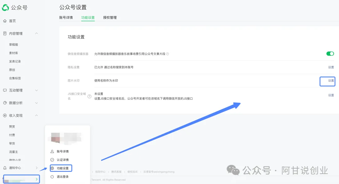 如果是需要关闭水印,在公众号首页左边侧边栏底部,点击账号详情,选择功能设置,找到图片水印,点击设置去关闭就行。