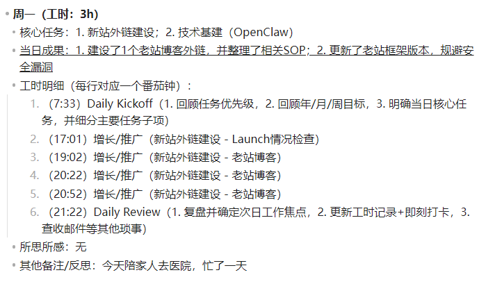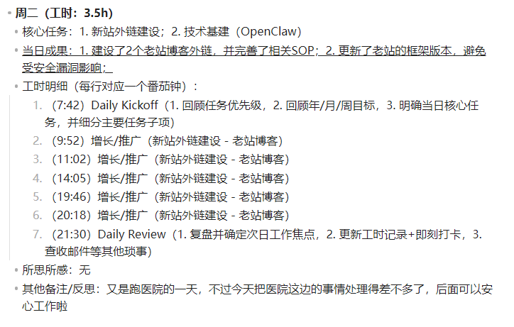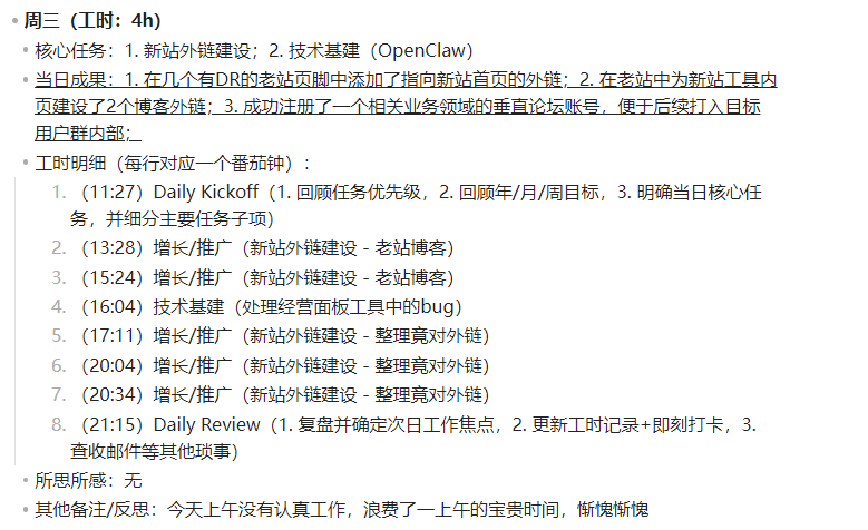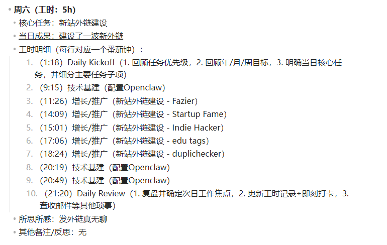 下周准备再建设一个新内页(针对一个之前规划好的Topic,也是用来获取SEO流量的工具页),然后剩下的时间继续发外链。如果还有多余时间的话,就搞搞OpenClaw,并顺便优化下网站的各种增长相关的零碎细节(比如Sitemap、引导分享、OpenGraph等等)