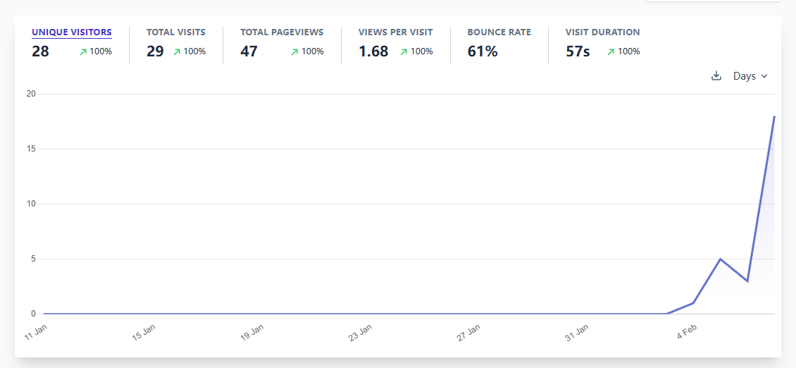 本周是新产品上线的第一周。本周完成了网站首页(品牌页)和一个内页(针对特定Topic的用于获取SEO流量的工具页)的开发和部署。然后建设了几个平台外链和Launch外链,以及十几个垃圾外链。目前产品的流量如图(画外音:好!很有精神!)