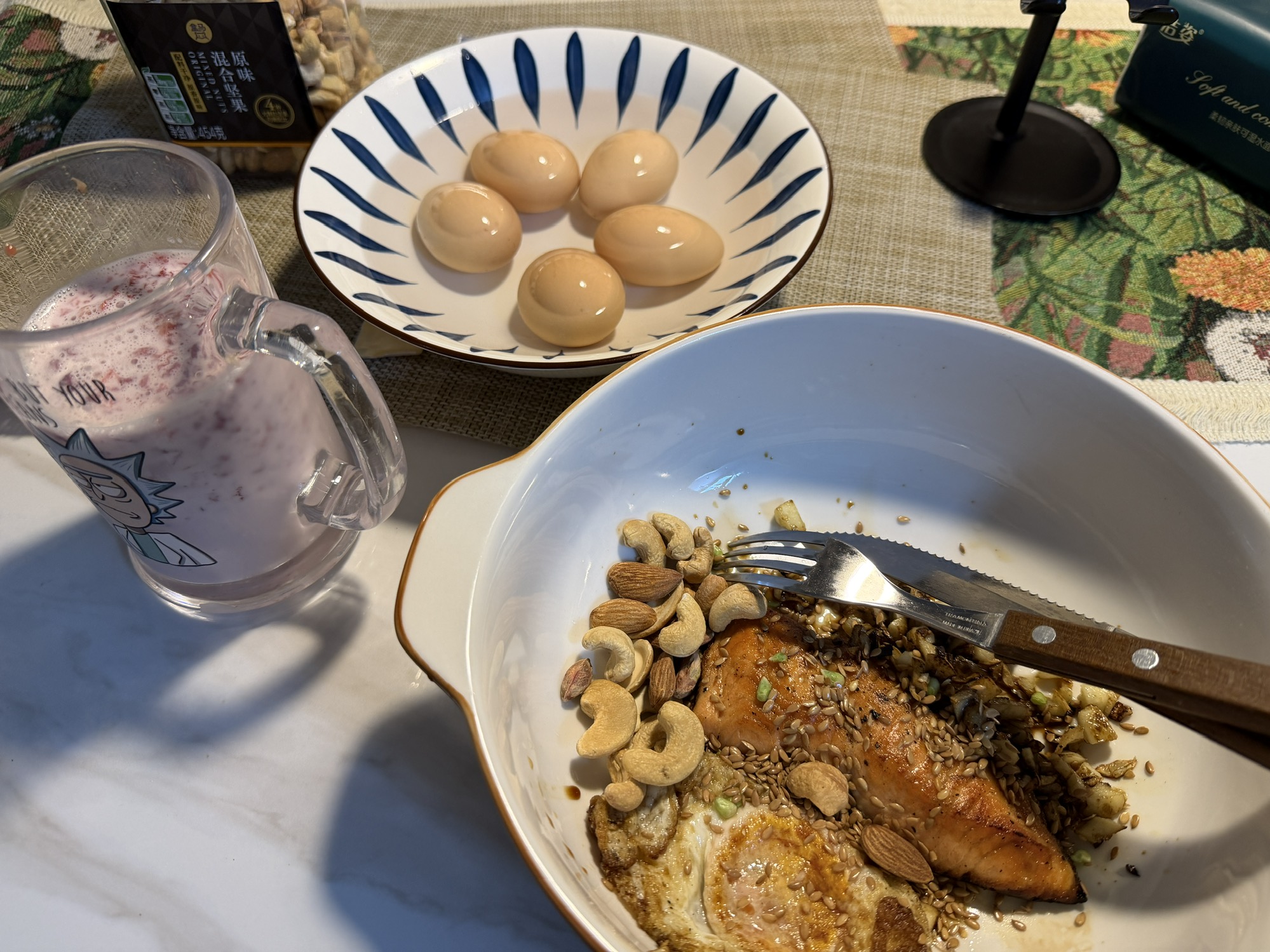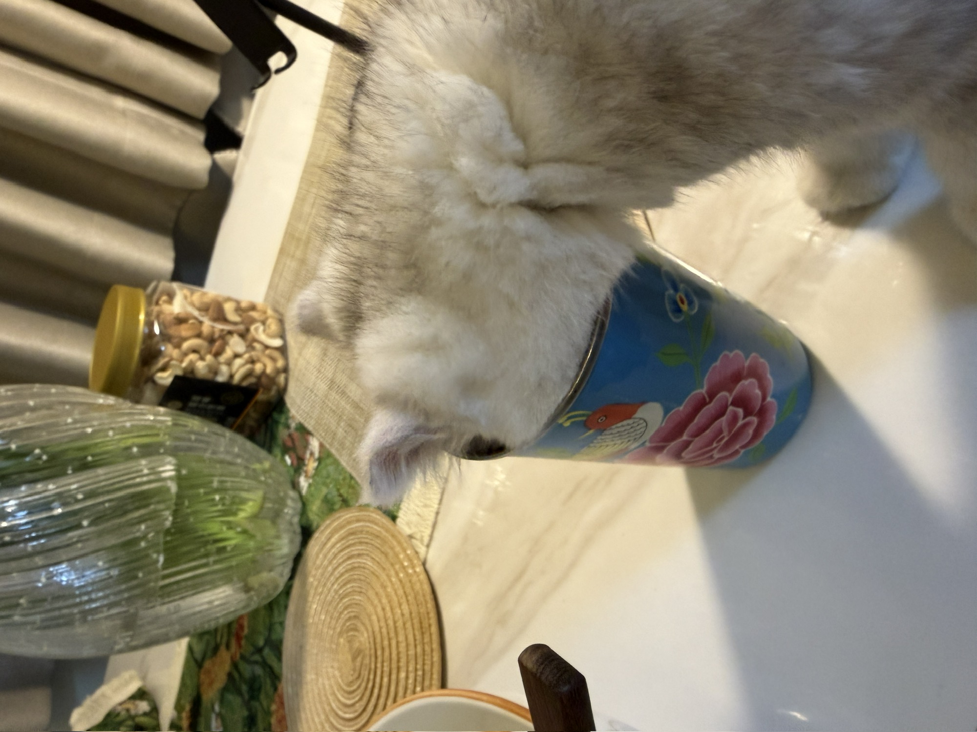 它像狗一样,偷偷跑到我的碗里要吃虾仁。我把碗端起来提防它的时候,结果忘了端牛奶。现在牛奶被它舔了几口,关键是它又不喝完,就喝几口然后走了。现在我拿着这杯牛奶,倒也不是,不倒也不是。