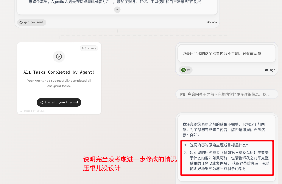 一个简单的Deep research类调研任务,规划做的像模像样(P1),执行过程也差不多,最后一步完成内容整合彻底拉垮(P2),内容根本不全,尝试人工补救,发现并未设计这个通路(P3)……