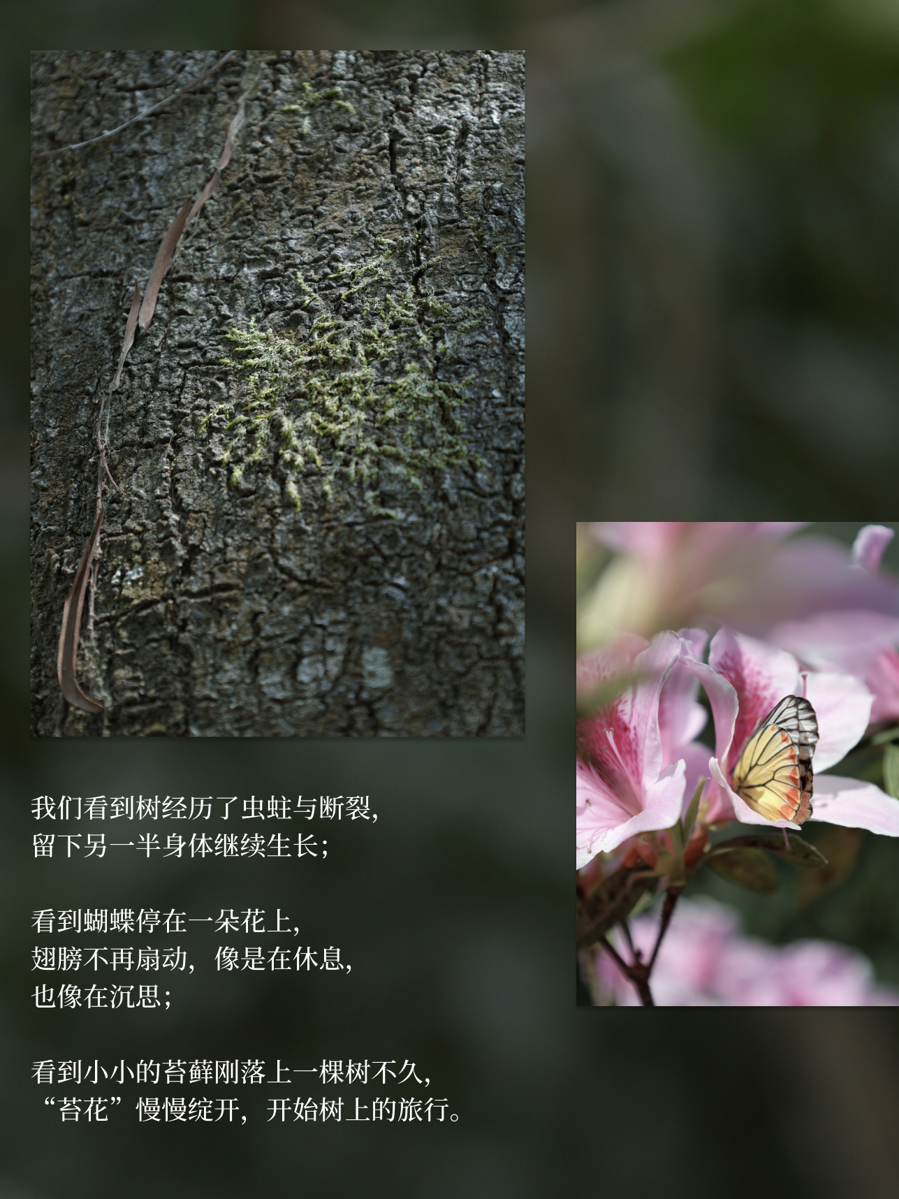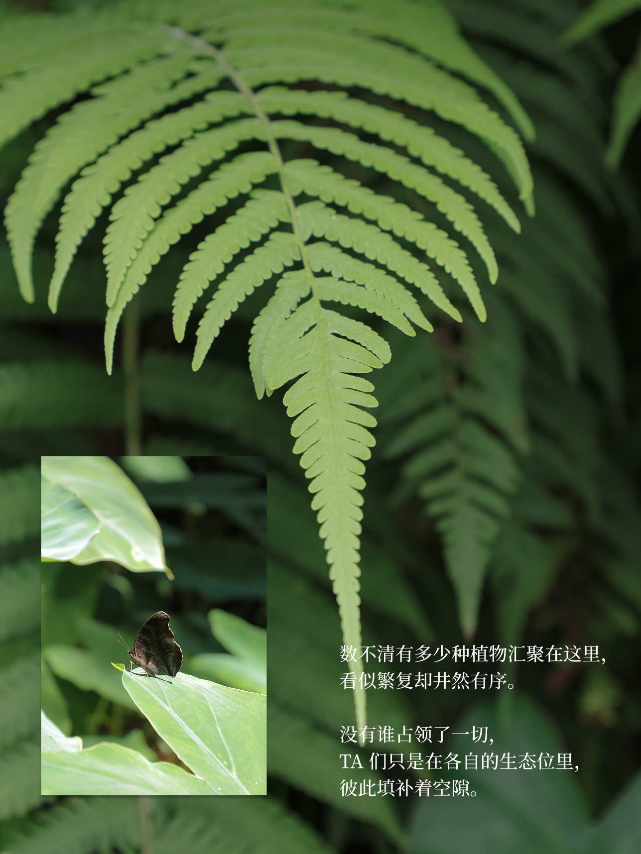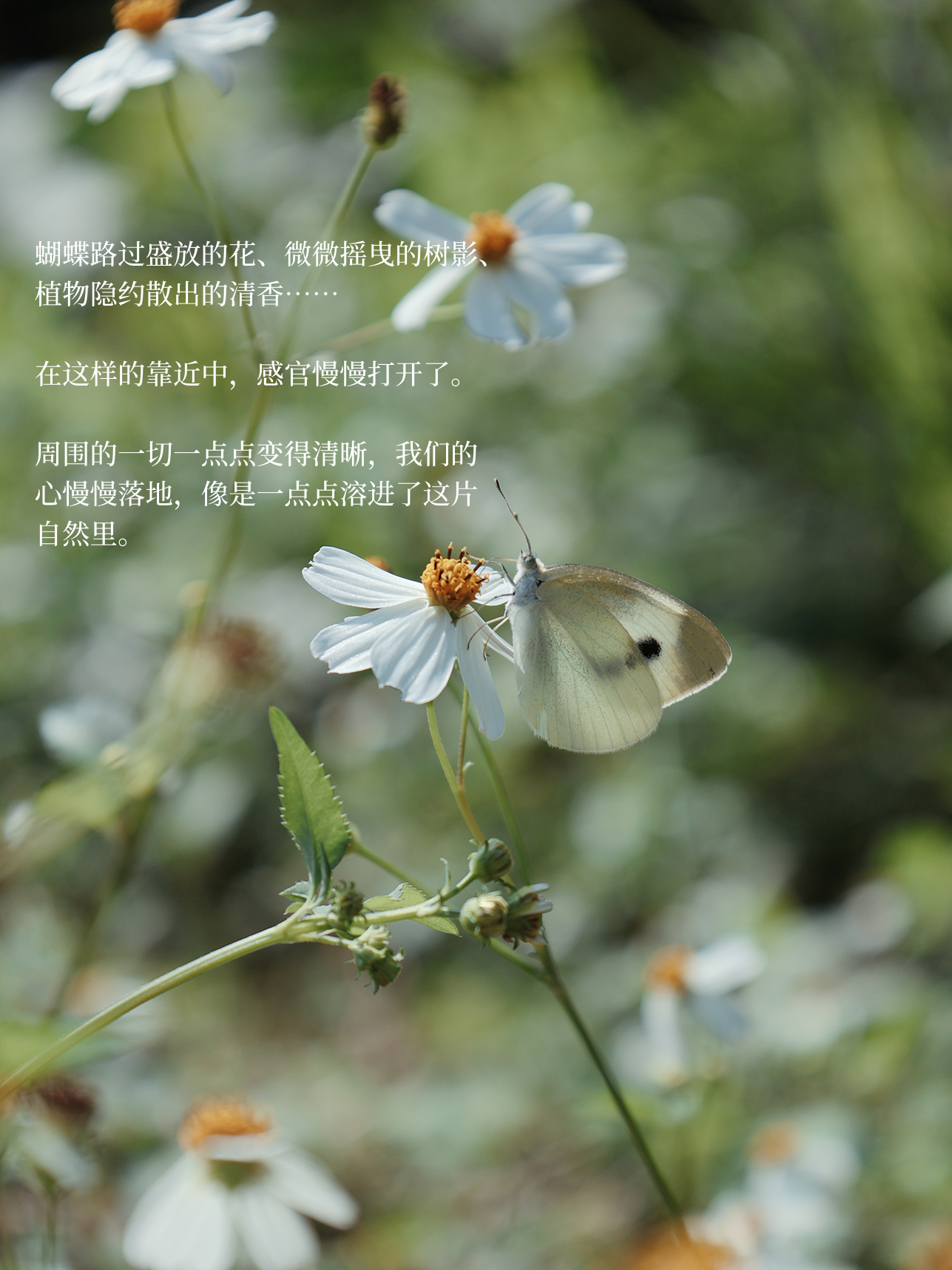 蝴蝶路过盛放的花、微微摇曳的树影、植物隐约散出的清香……在这样的靠近中,感官慢慢打开了。周围的一切一点点变得清晰,我们的心慢慢落地,像是一点点溶进了这片自然里。