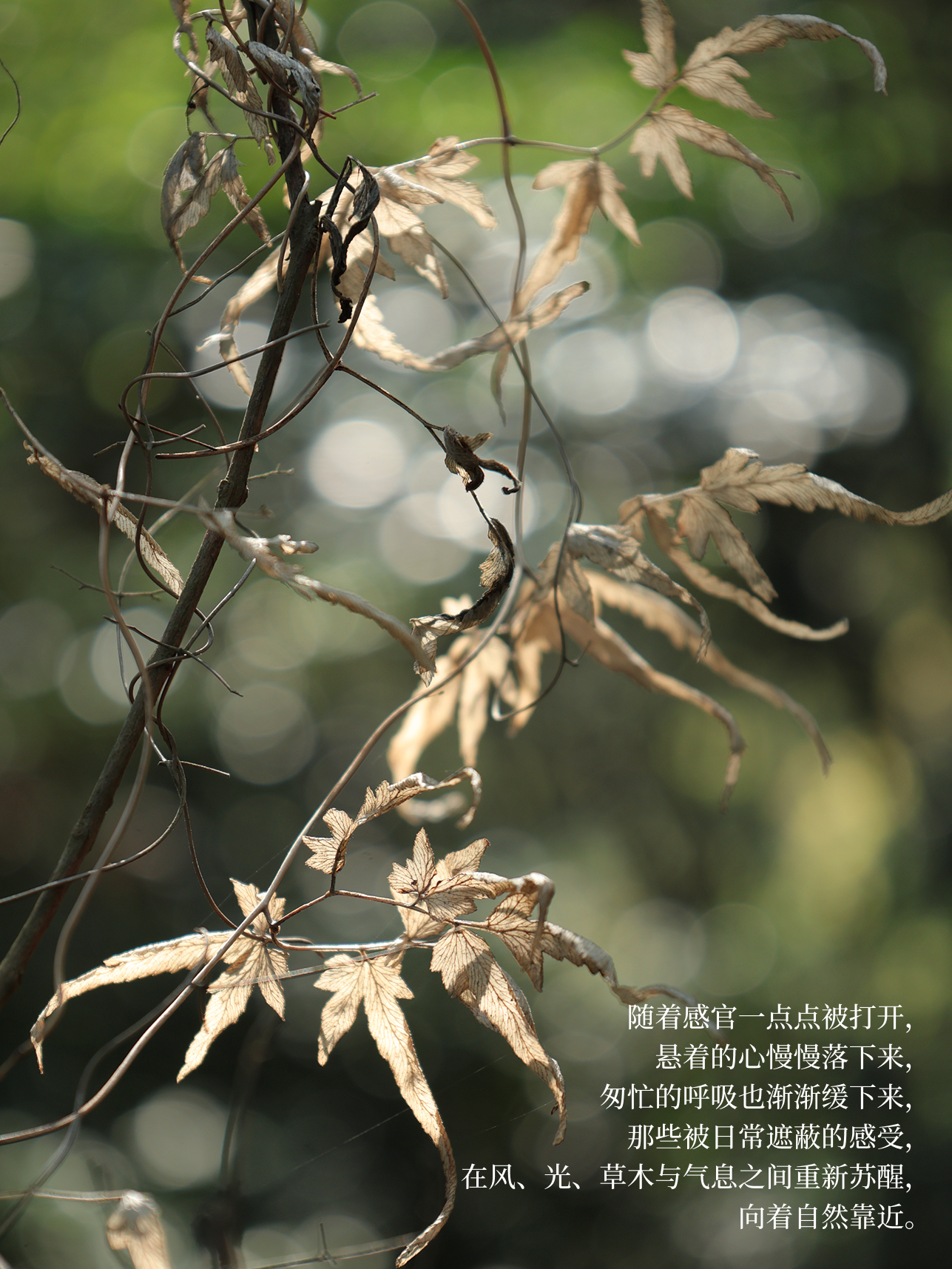 随着感官一点点被打开,悬着的心慢慢落下来,匆忙的呼吸也渐渐缓下来,那些被日常遮蔽的感受,在风、光、草木与气息之间重新苏醒,向着自然靠近。