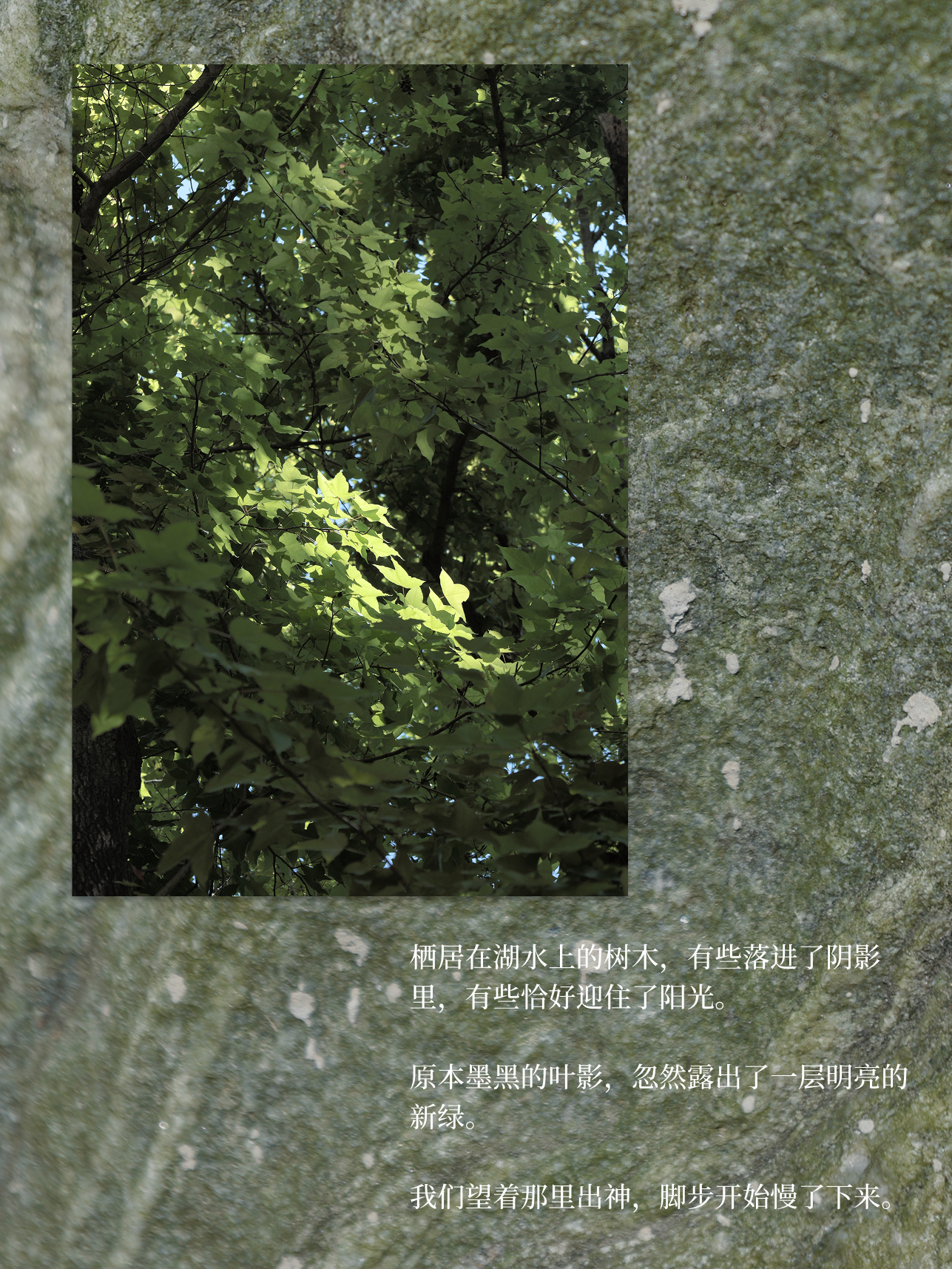 栖居在湖水上的树木,有些落进了阴影里,有些恰好迎住了阳光。原本墨黑的叶影,忽然露出了一层明亮的新绿。我们望着那里出神,脚步开始慢了下来。