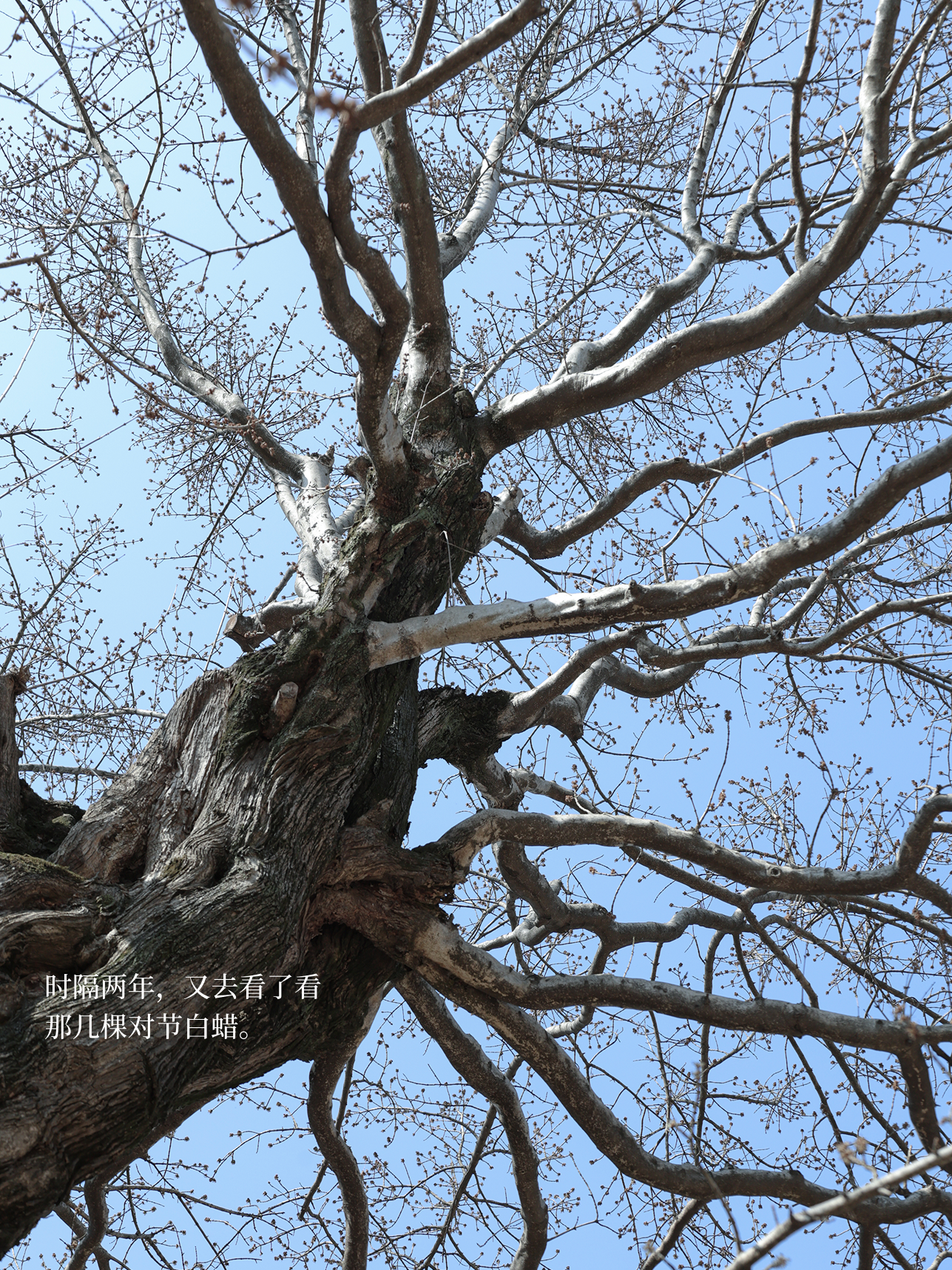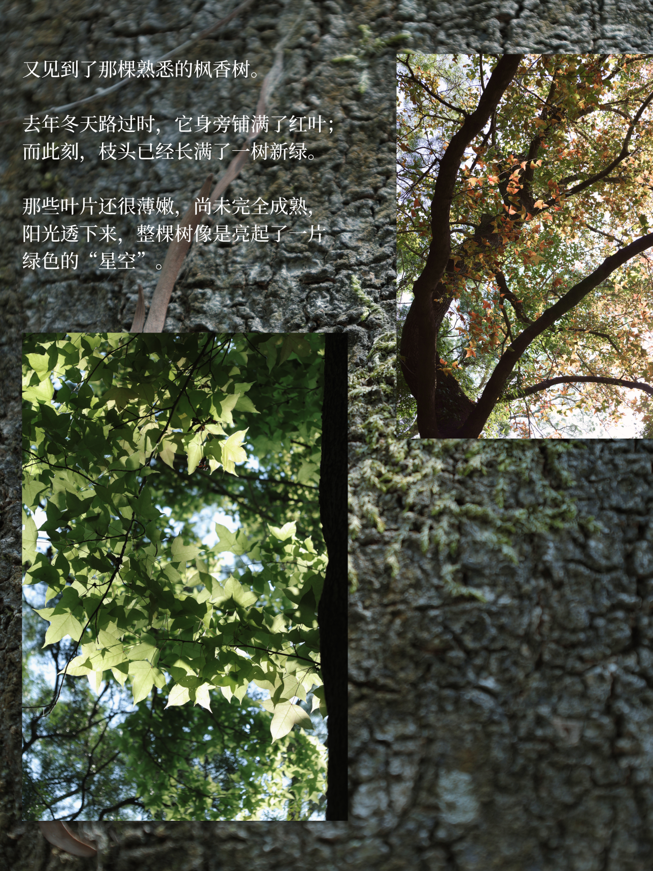 又见到了那棵熟悉的枫香树。去年冬天路过时,它身旁铺满了红叶;而此刻,枝头已经长满了一树新绿。那些叶片还很薄嫩,尚未完全成熟,阳光透下来,整棵树像是亮起了一片绿色的“星空”。