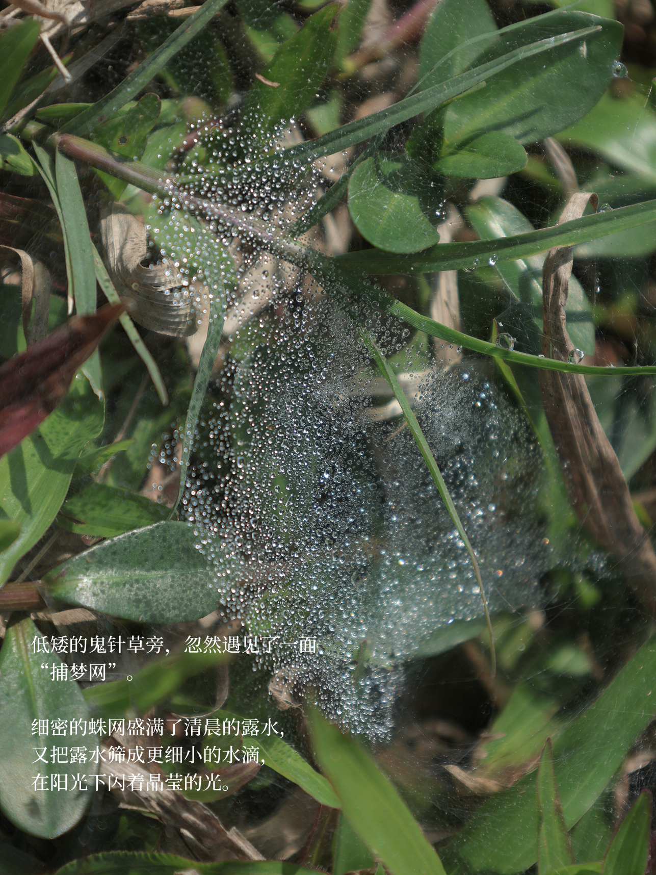 低矮的鬼针草旁,忽然遇见了一面“捕梦网”。细密的蛛网盛满了清晨的露水,又把露水筛成更细小的水滴,在阳光下闪着晶莹的光。