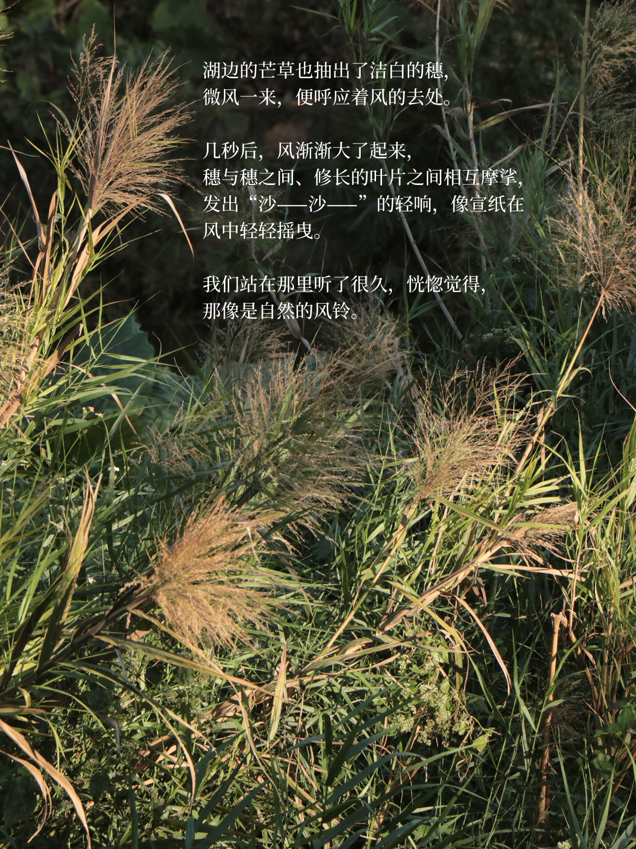湖边的芒草也抽出了洁白的穗,微风一来,便呼应着风的去处。几秒后,风渐渐大了起来,穗与穗之间、修长的叶片之间相互摩挲,发出“沙——沙——”的轻响,像宣纸在风中轻轻摇曳。我们站在那里听了很久,恍惚觉得,那像是自然的风铃。
