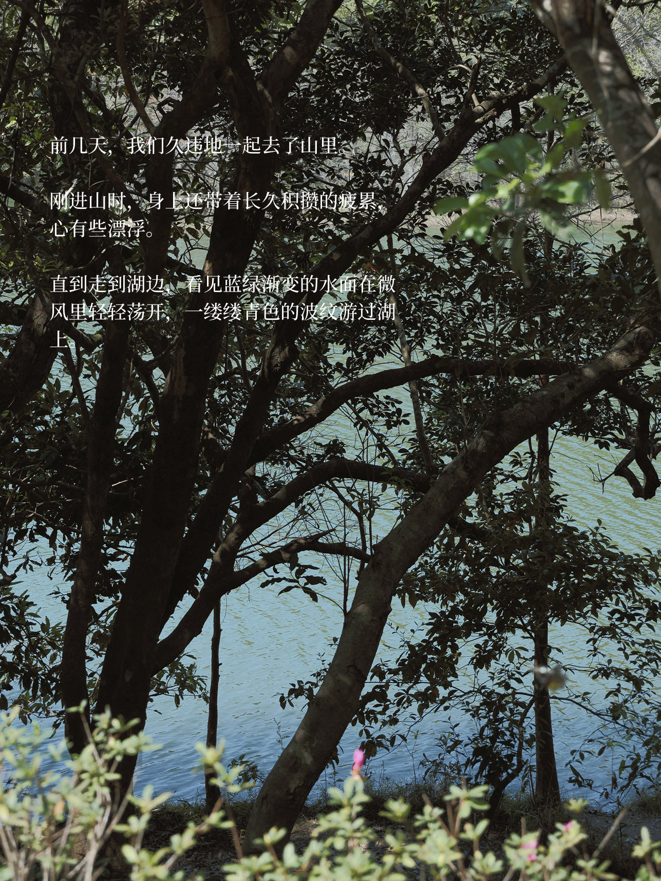 刚进山时,身上还带着长久积攒的疲累,心有些漂浮。直到走到湖边,看见蓝绿渐变的水面在微风里轻轻荡开,一缕缕青色的波纹游过湖上。
