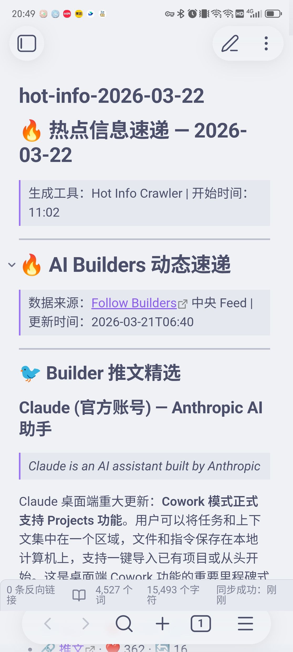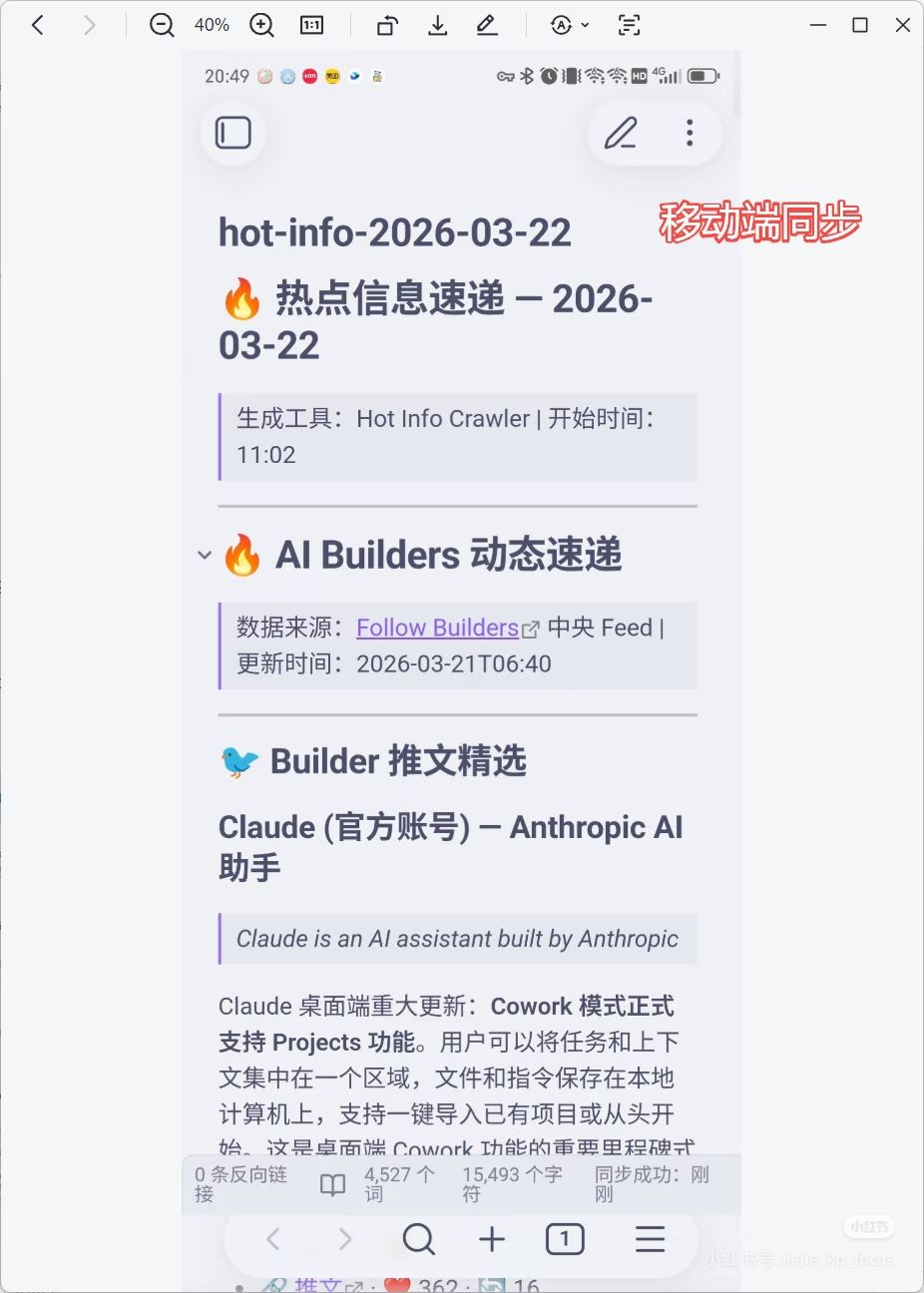 这个skill预设了 AI 前沿理论、AI工具,投资理财、思维模型、家庭教育几个领域,一句话触发,它就自动帮我把各平台热点抓回来、总结成中文、存进我的obsidian知识库中,并自动同步到移动端,我每天起床打开手机即可以看到最新的推送消息。