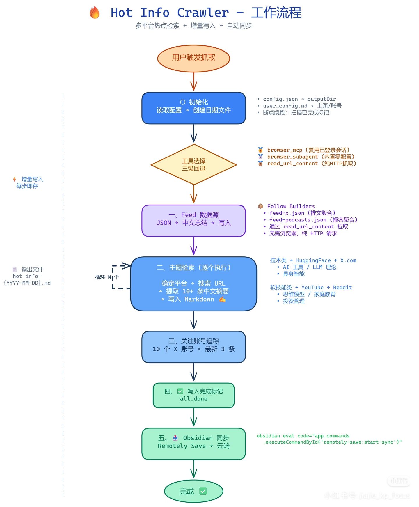 2️⃣ 工具三级回退 — 优先用浏览器 MCP(能复用已登录的会话),不行就降级到内置浏览器,再不行就纯 HTTP 抓取,确保总能拿到数据