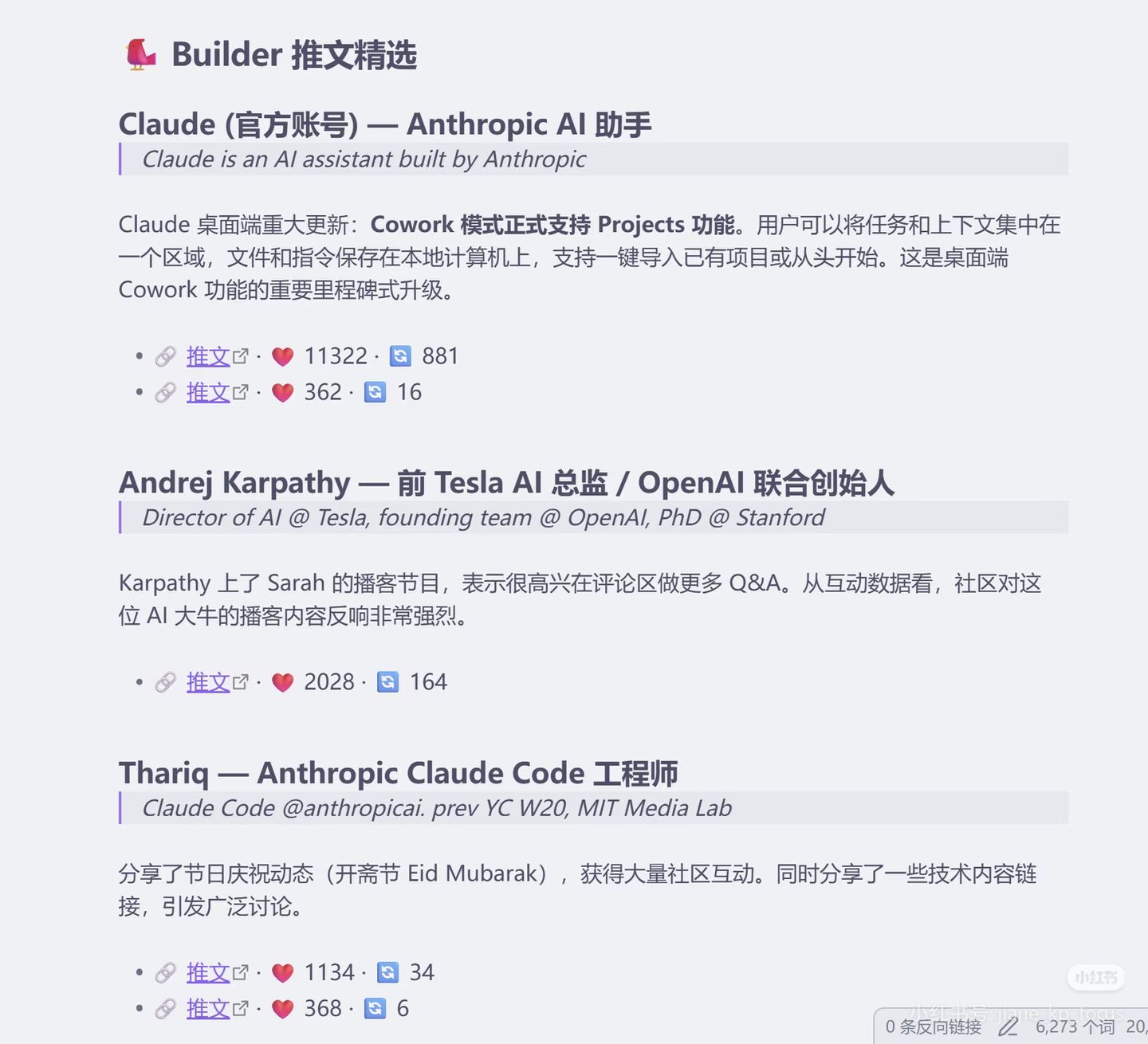 5️⃣ 关注账号追踪 — 10 个我长期关注的 X 大 V,每人抓最新 3 条动态(Karpathy、Jim Fan、Ethan Mollick 这些大佬全在里面)