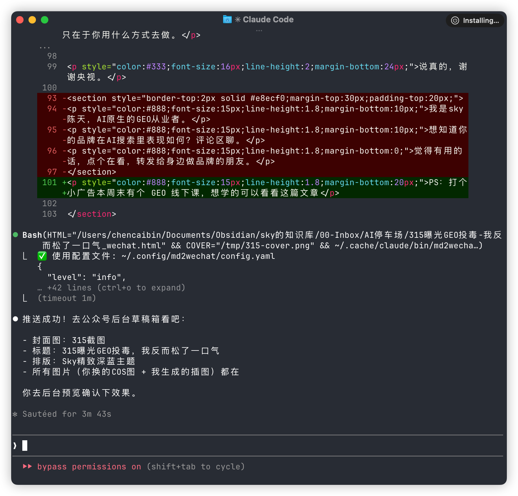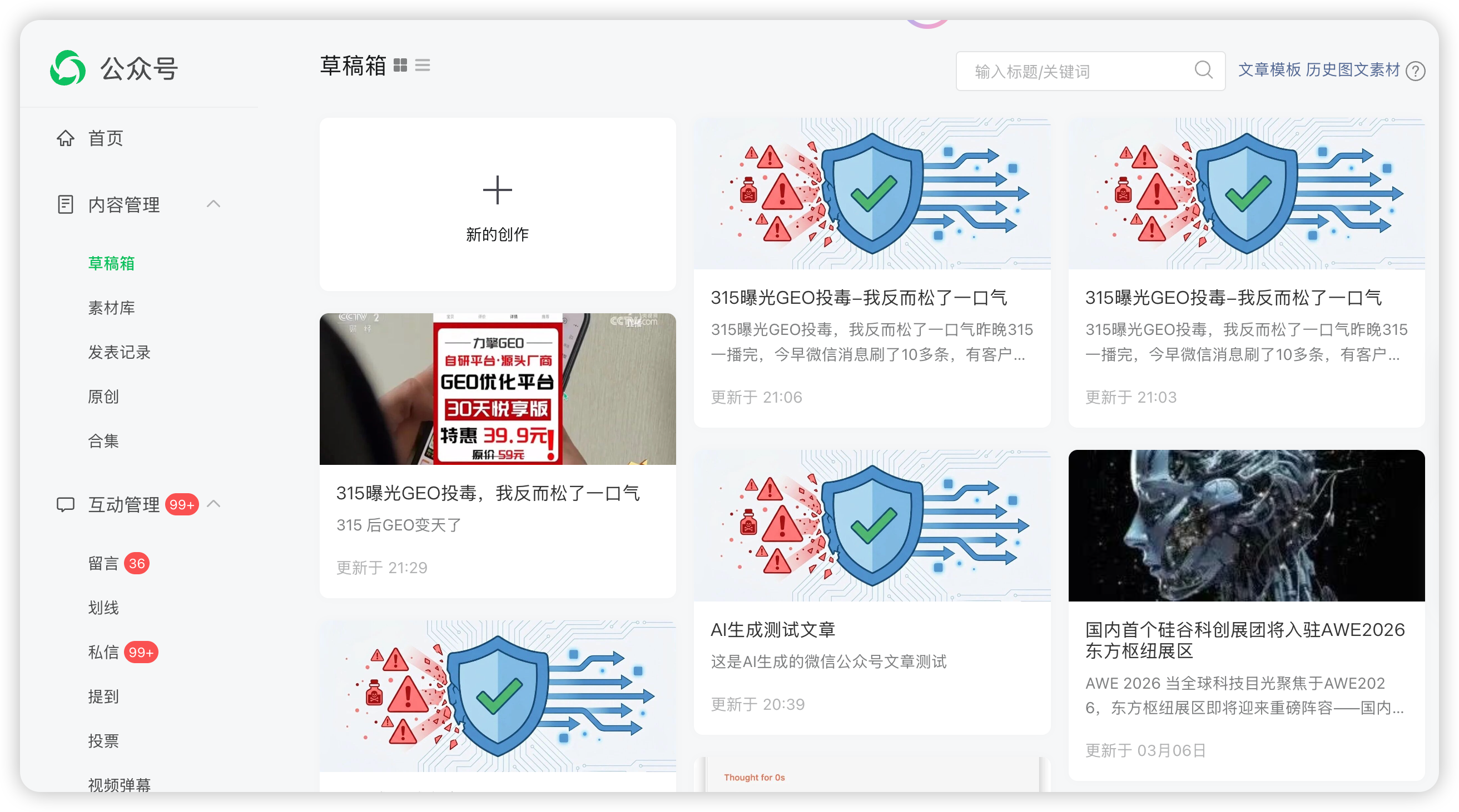 今天这篇315 GEO投毒的文章就是这么出来的,从初稿到草稿箱大概40分钟搞定
