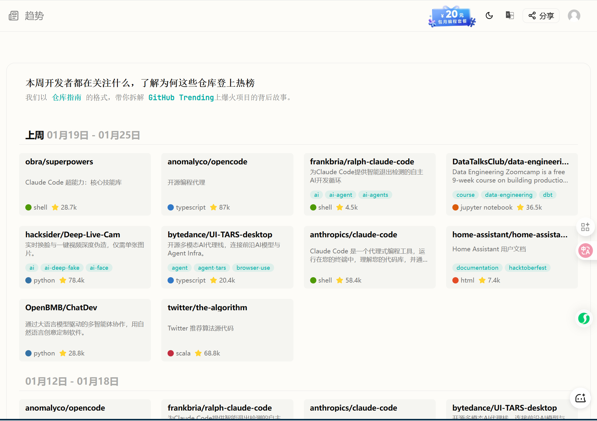 另外它还能看每周热门仓库,也会根据搜索记录推感兴趣的,找项目啥的超方便。现在我逛GitHub全靠它,省老多事了,推荐大伙试试!