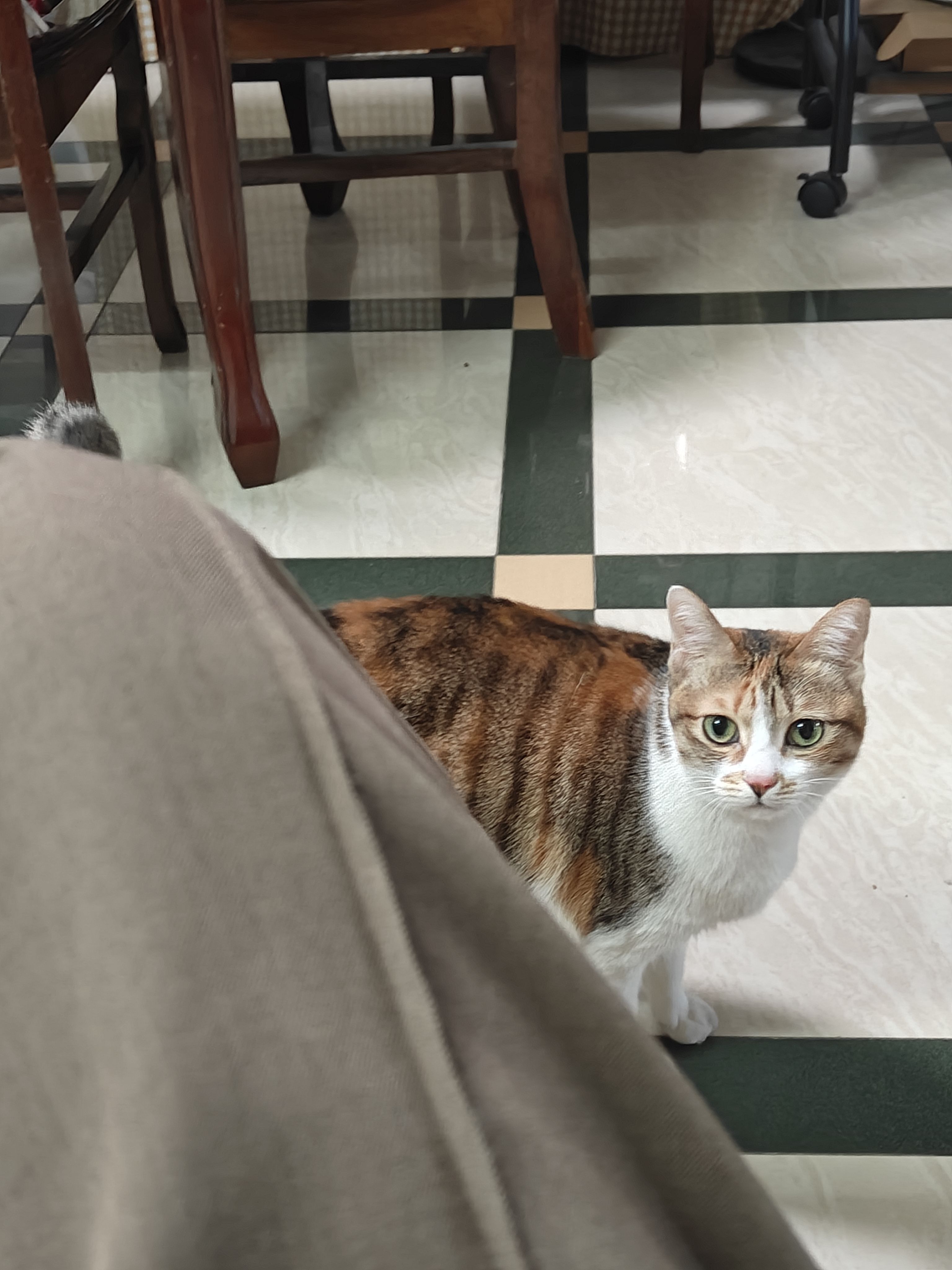 今天早上去看病,回家路上看到一个荒废的店面里面有一只大猫。仔细一看,有点眼熟,好像是旁边商户的猫。我妈说是不是里面联通的所以猫过来玩了。我马上找旁边商户,阿叔和阿姨听到马上冲出去。就是他们的猫,他们已经找了一早上了。来不及和我们道谢,他们马上开始尝试喊猫出来,我和妈妈就回家了。