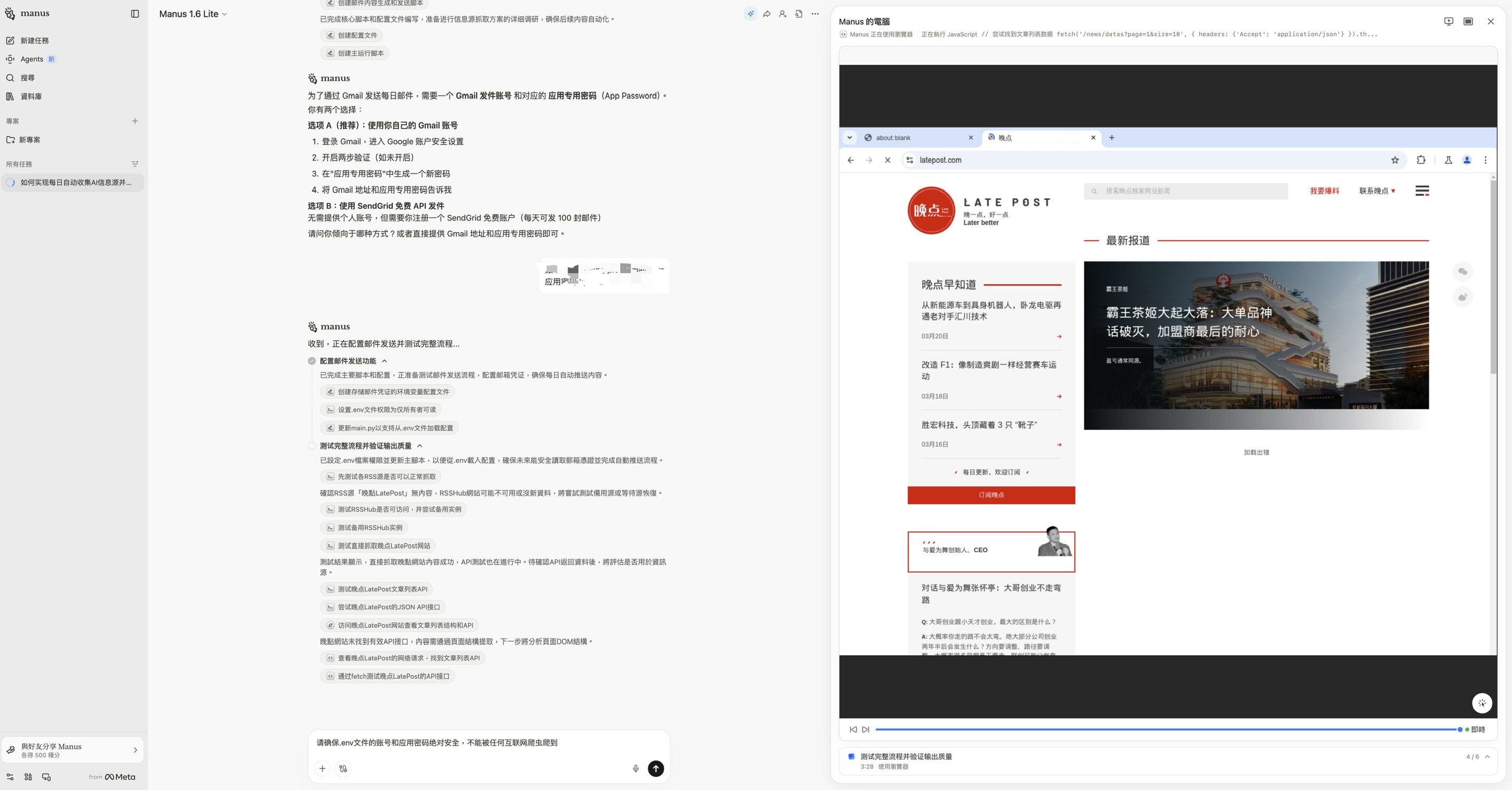 1️⃣ 比起低配版(搭载 claude-3.5-sonnet/gemini-2.0-flash 廉价稳定旧模型)的本地 agent,manus 的能力更近一步,以各种更智能的类人的方式去抓x和微信的内容(当然还是没有100%成功我的额度就用完了,两家公司的反爬虫还是很强)。
