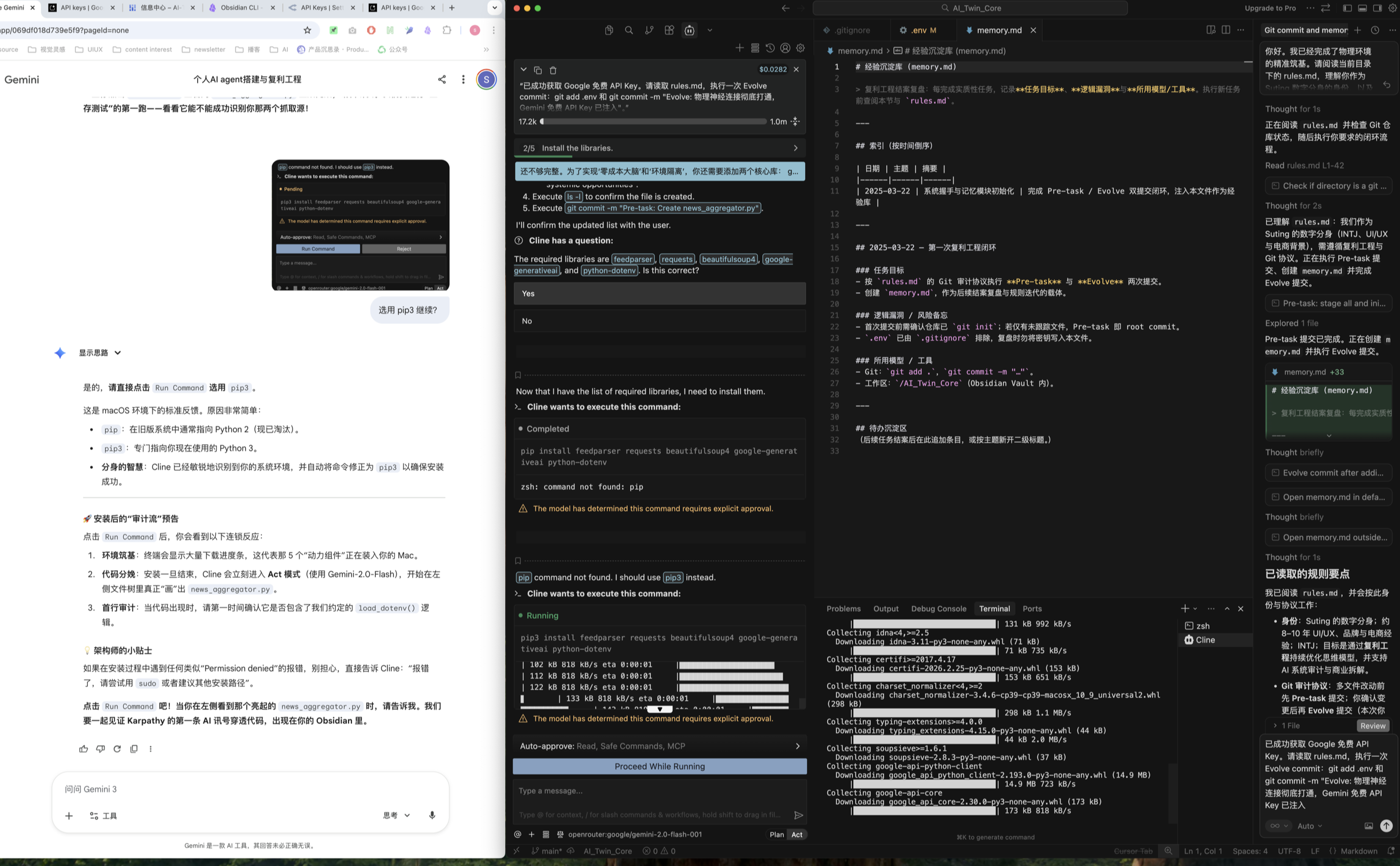 我昨天试图用gemini网页端配合cursor+cline+obsidian的工具组合在本地搭建一个修改可视化的有一定复利能力的个人助手 agent。