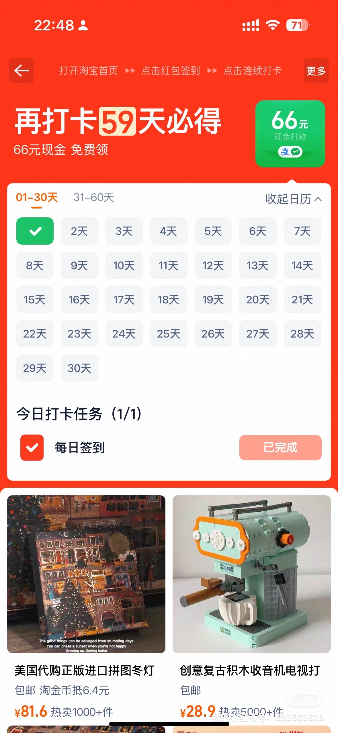 大家快冲,只要每天定个闹钟去打卡,就有约等于每天一块钱的收益,淘宝又在撒钱啦