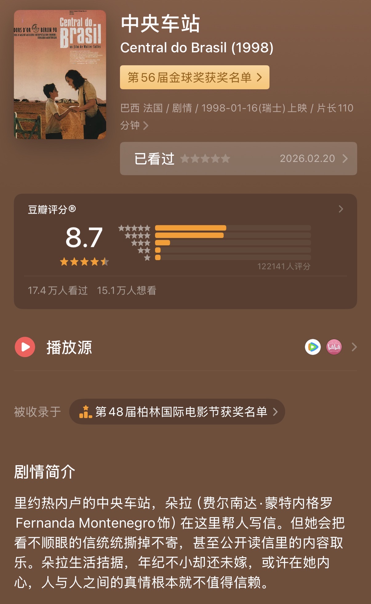《中央车站》一个童话般的故事,但是是很真也很克制的那种。配乐的弦乐(中提琴?)和吉他曲都很好听。美中不足的是人名Jesus翻译成了耶稣,译者一定不看英超,翻译成热苏斯多好😄