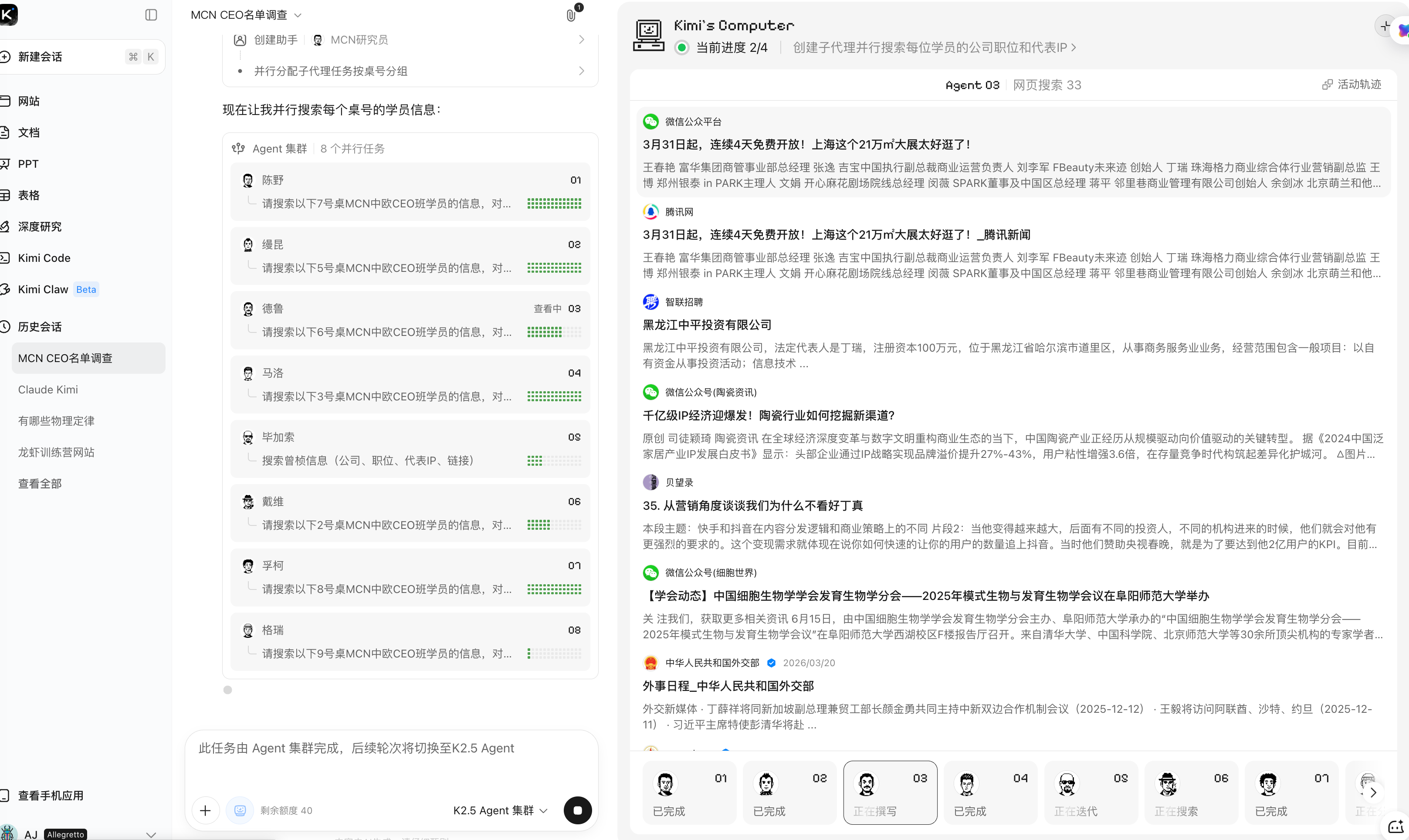 kimi agent集群太适合做名单调查了,今天参加中欧商学院的课程,把老师发的同学名单丢给kimi,开始一个个进行搜索调查