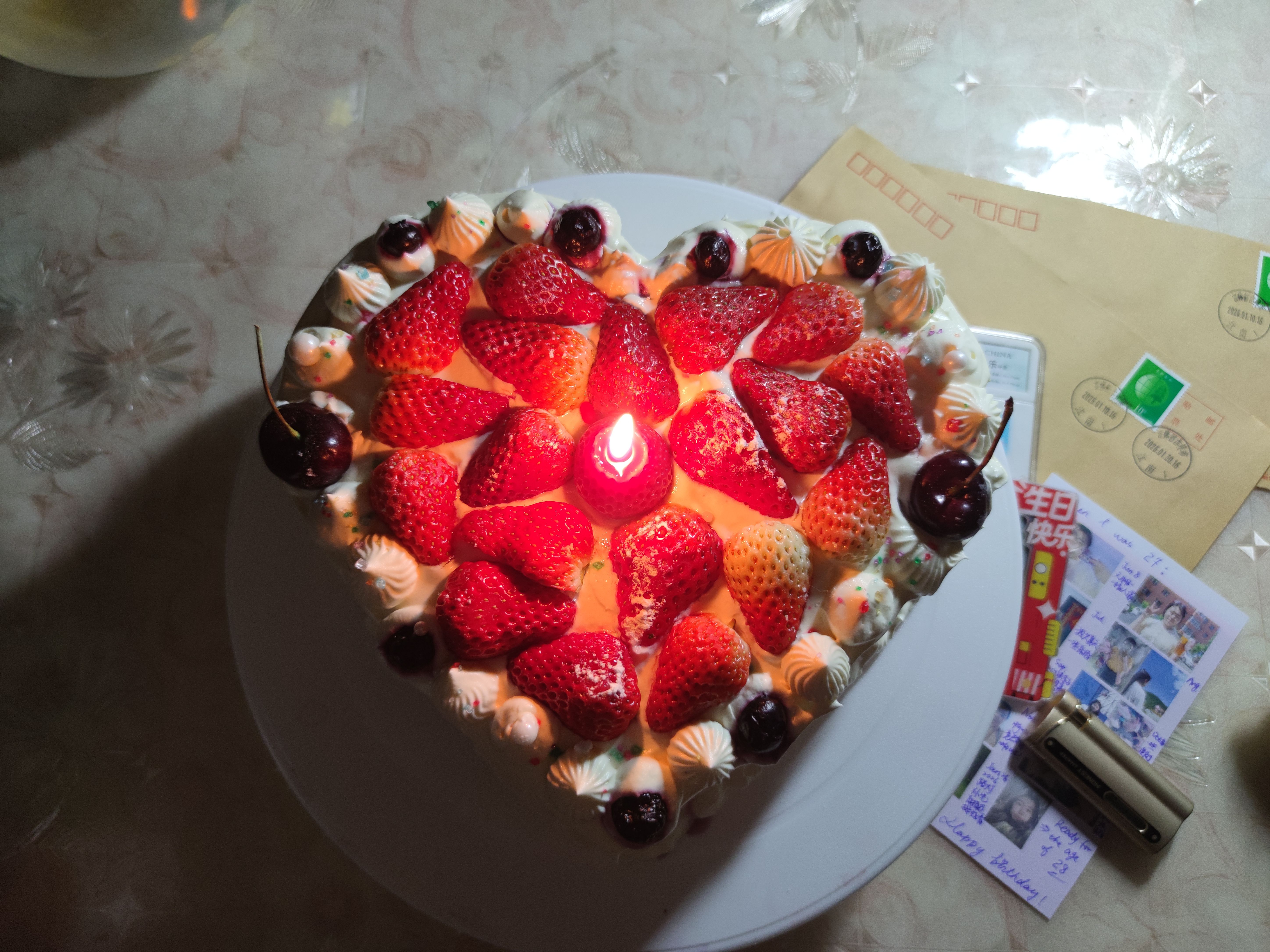 ②自己做蛋糕的第七年。今年想拥有一个心形蛋糕,又想要一个草莓蛋糕,于是生成了心形草莓蛋糕。就连蜡烛都是草莓形状~上面撒了糖粉、钻石糖、珍珠糖,用车厘子和冰蓝莓点缀。