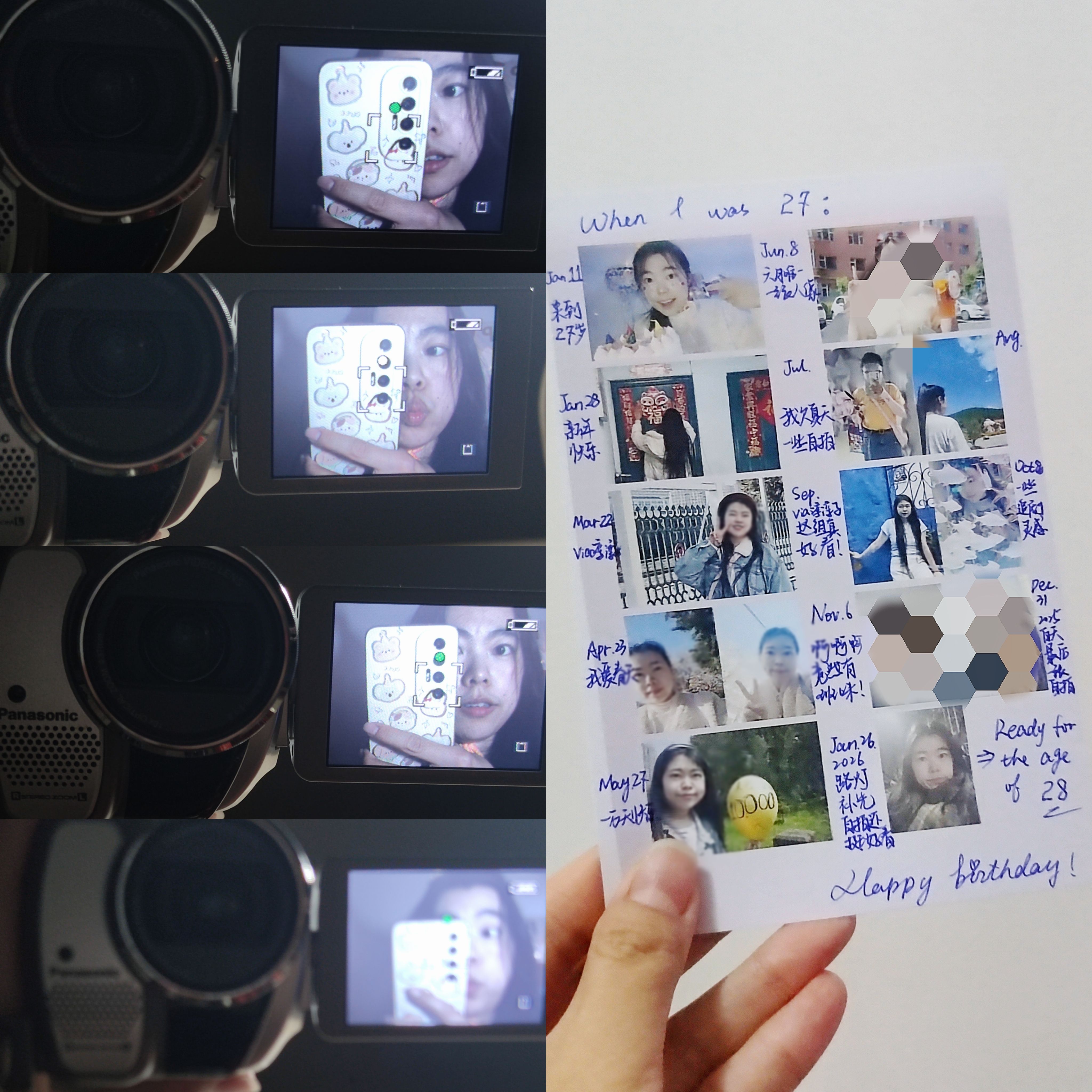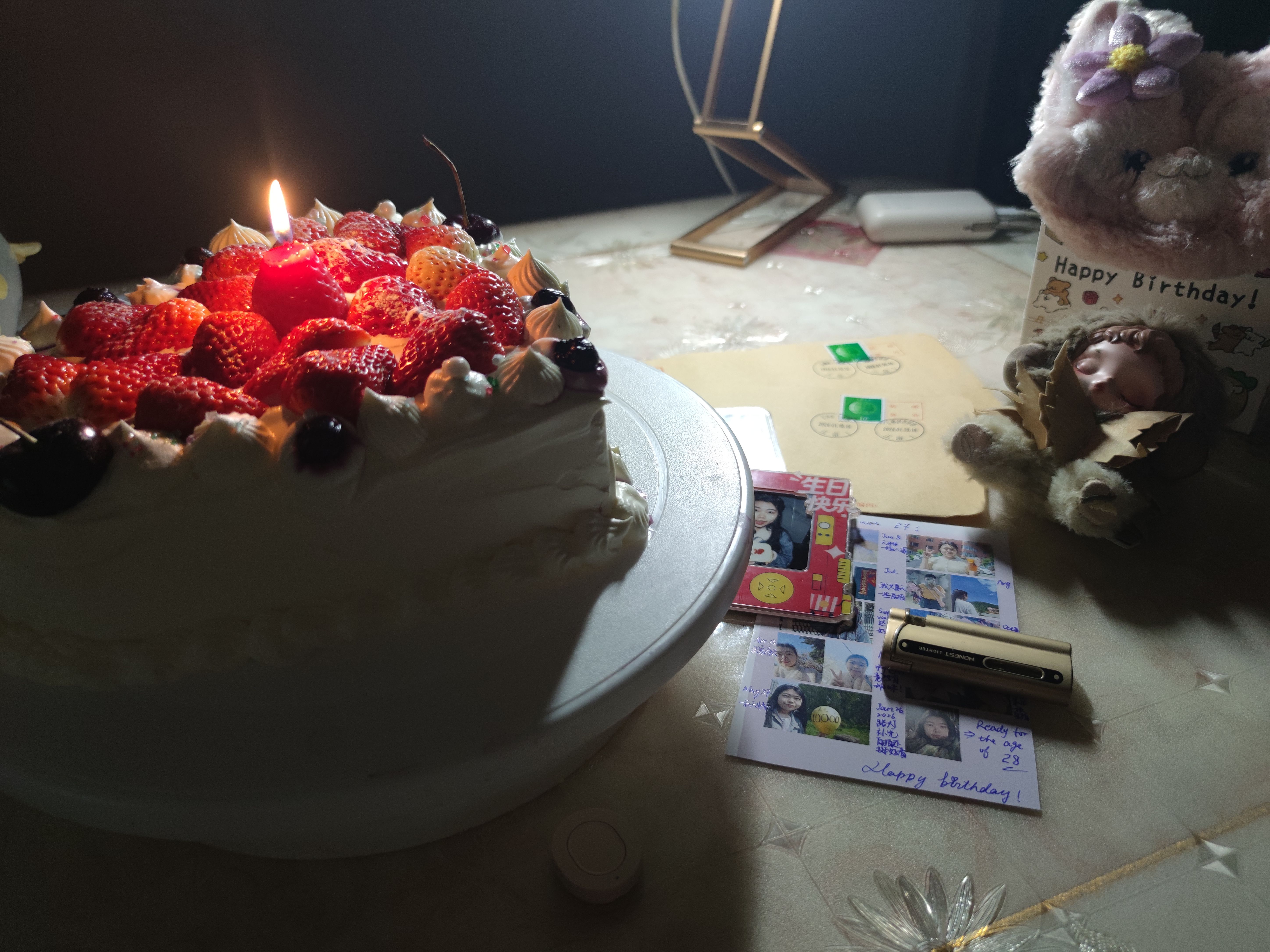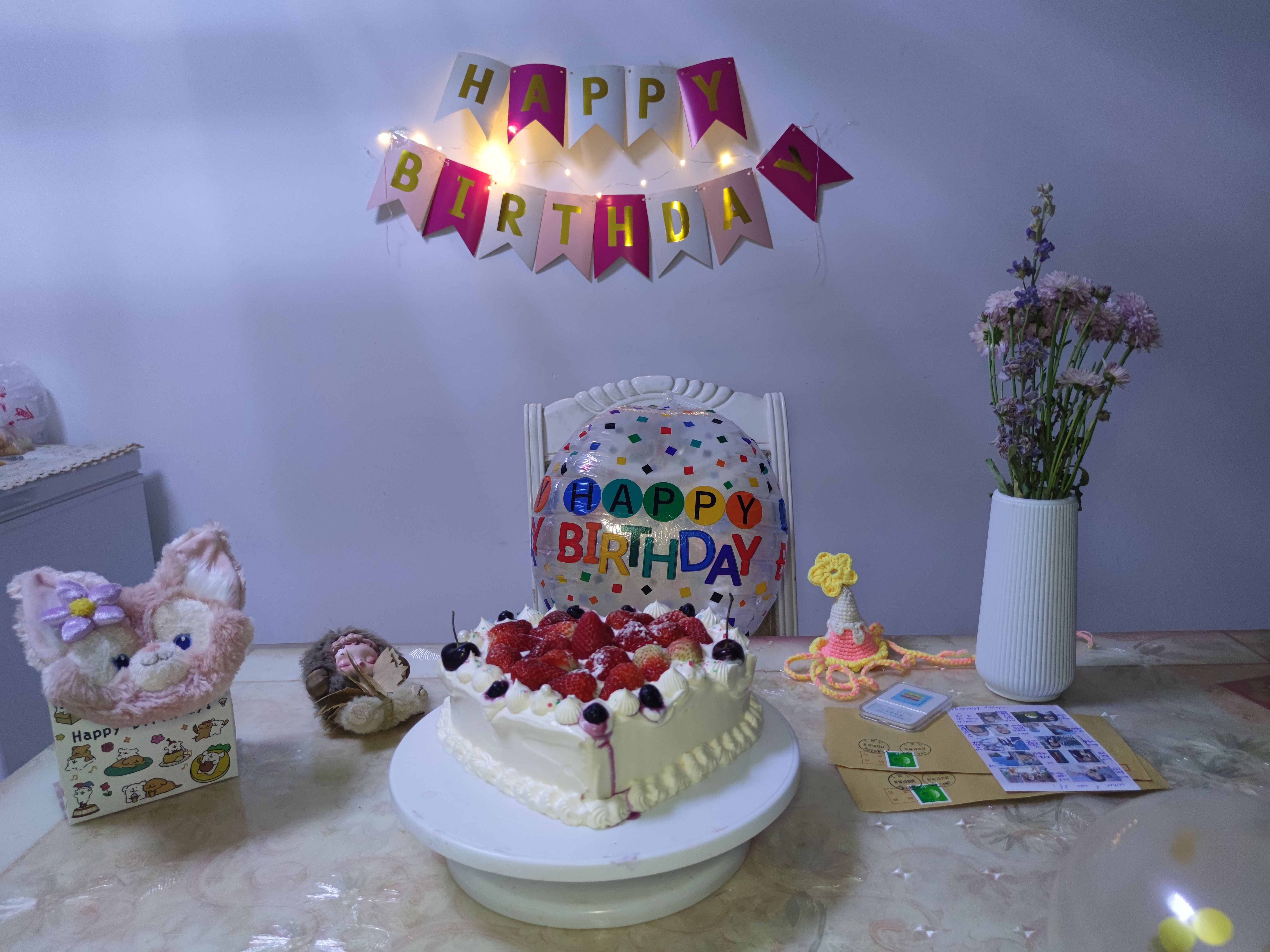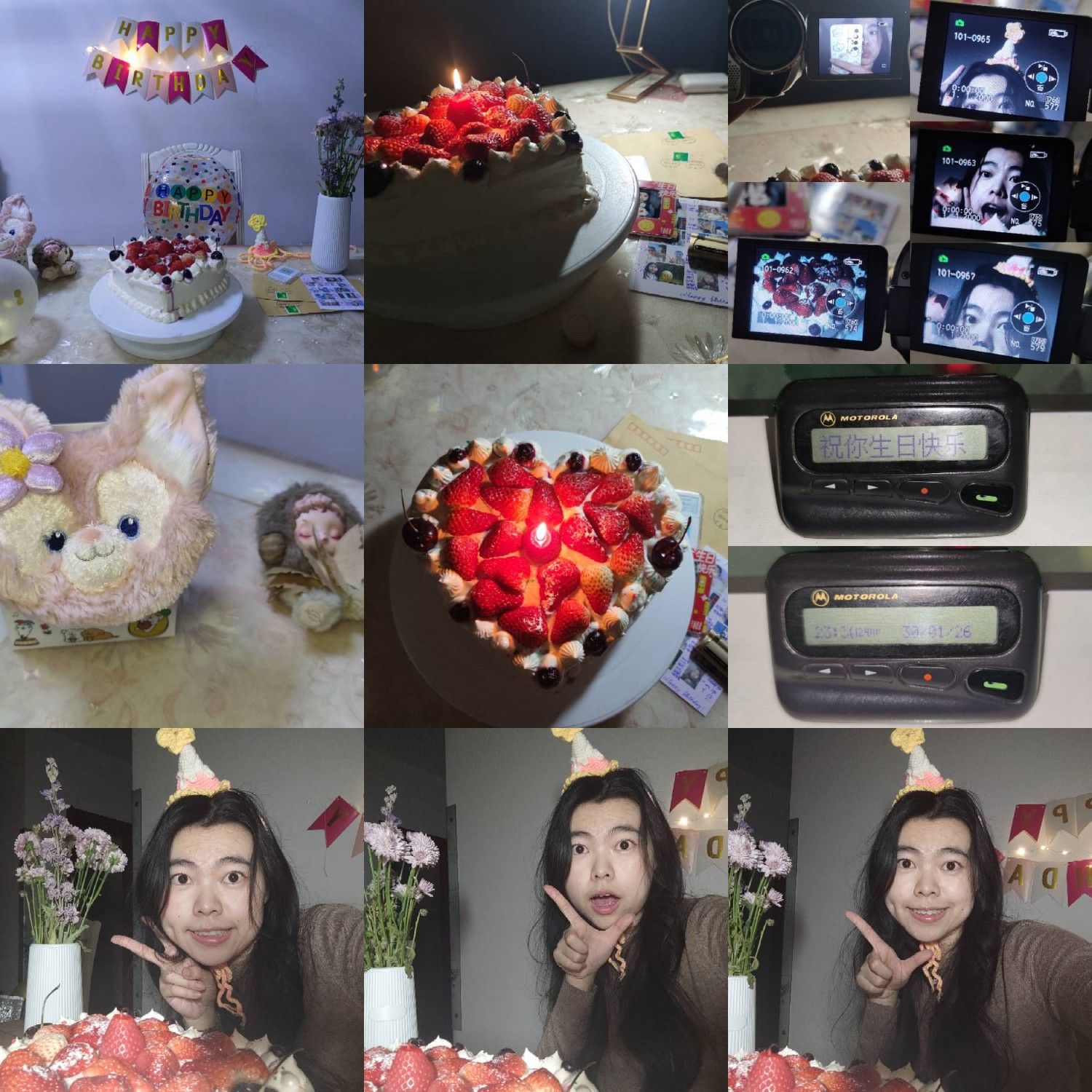 (道具如下:a. 生日蛋糕;b. 生日拉旗+LED小串灯;c. 自己手搓的钩针生日帽;d. 妈妈吹的气球;e. 好朋友送的生日礼物;f. 公历生日买的花;g. 过去一岁不同月份照片做的大头贴;h. 写着生日快乐的冰箱贴;i. 打火机;j. 手机支架;k. 补光灯+移动电源;l. 今年公历和农历生日两天的日期邮戳)(1月30日的其中一个邮戳是自己亲手敲的。)