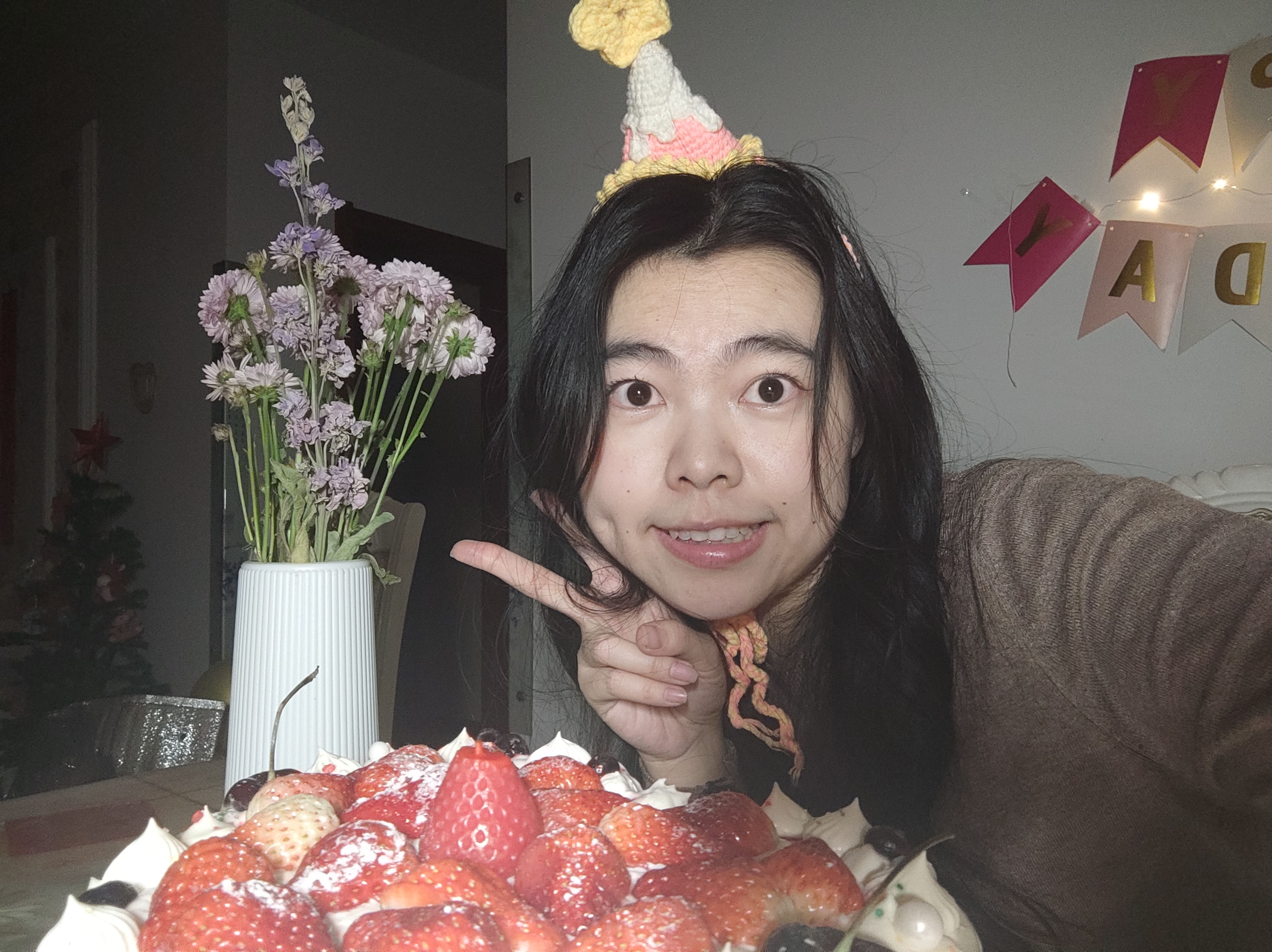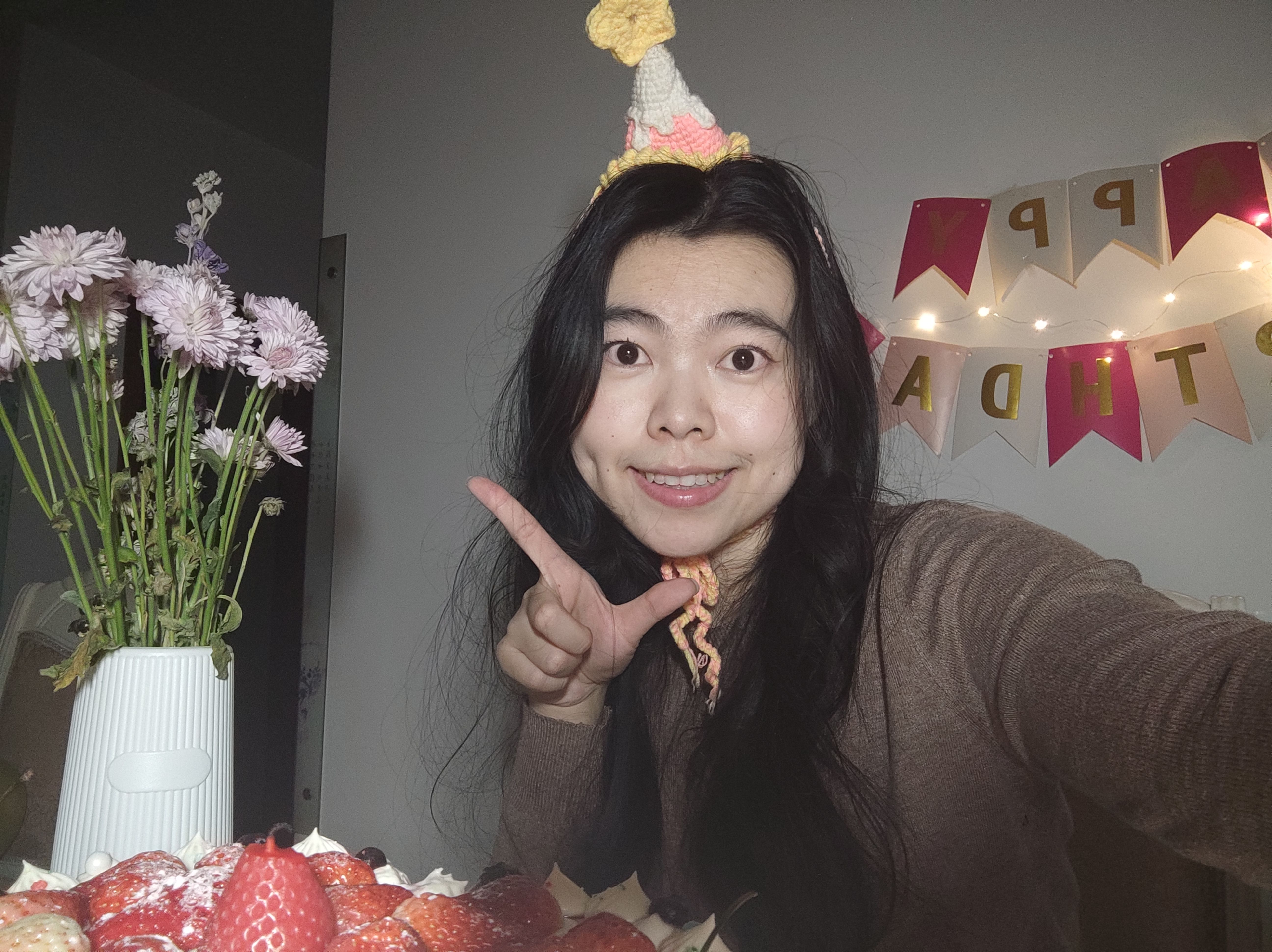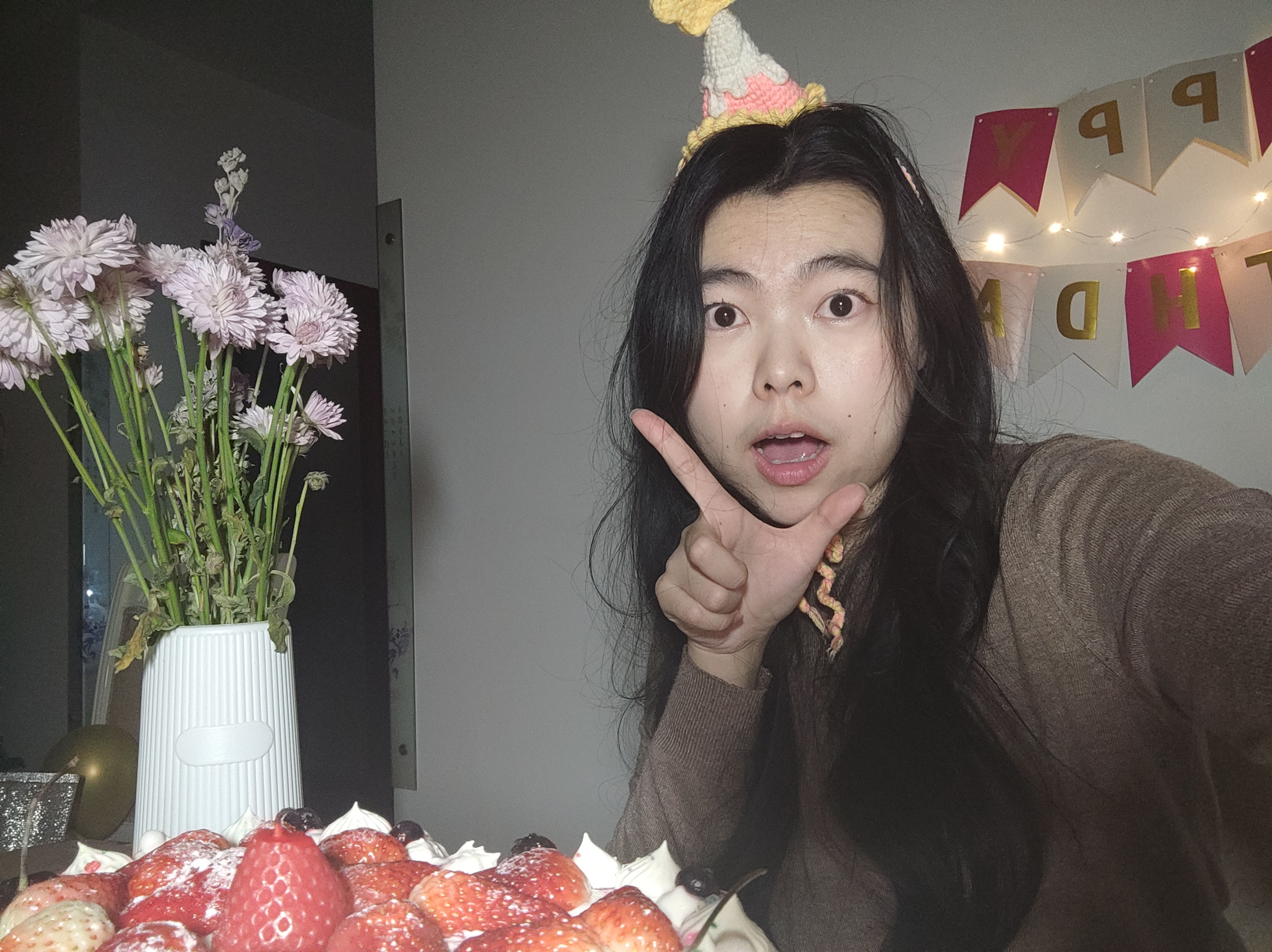 (道具如下:a. 生日蛋糕;b. 生日拉旗+LED小串灯;c. 自己手搓的钩针生日帽;d. 妈妈吹的气球;e. 好朋友送的生日礼物;f. 公历生日买的花;g. 过去一岁不同月份照片做的大头贴;h. 写着生日快乐的冰箱贴;i. 打火机;j. 手机支架;k. 补光灯+移动电源;l. 今年公历和农历生日两天的日期邮戳)(1月30日的其中一个邮戳是自己亲手敲的。)