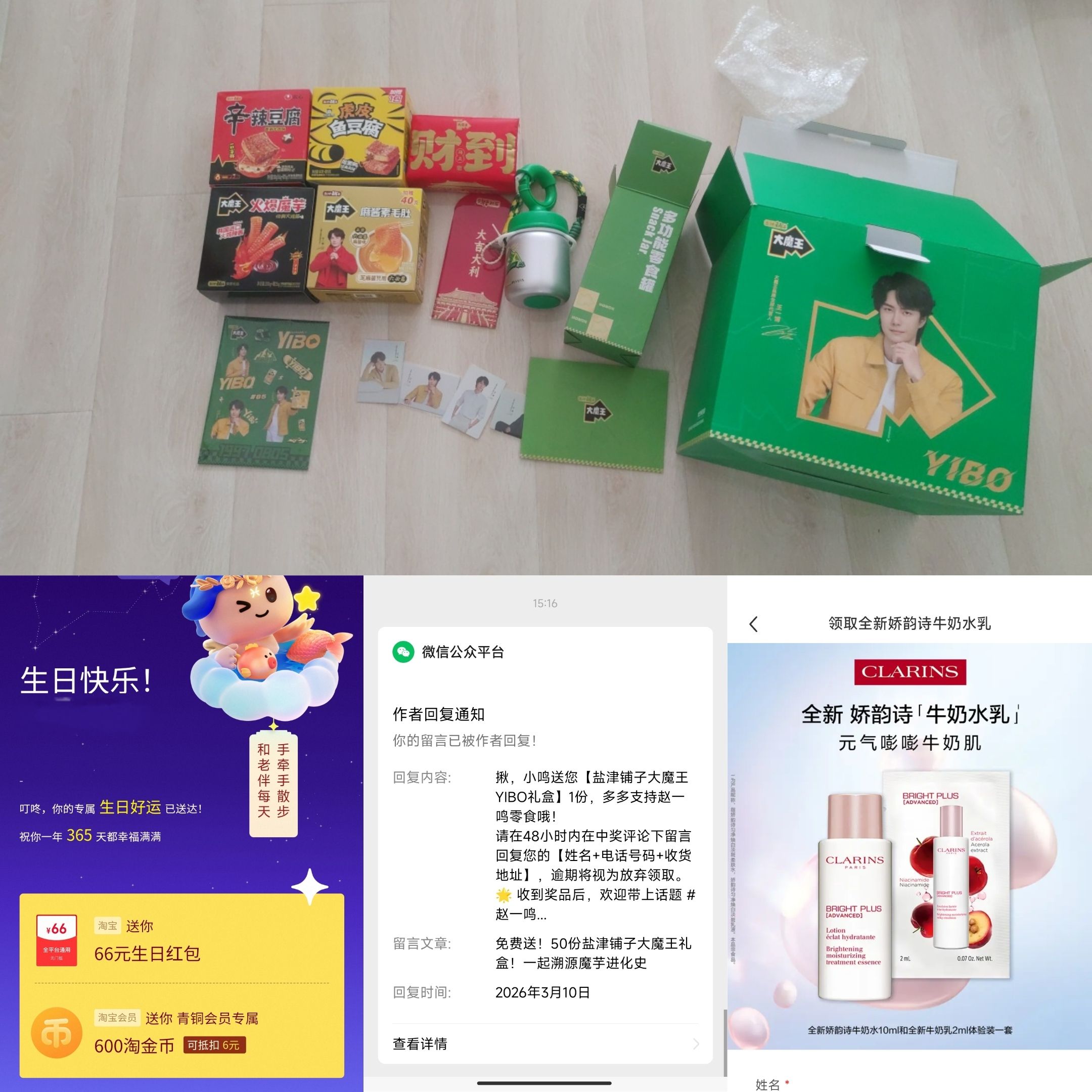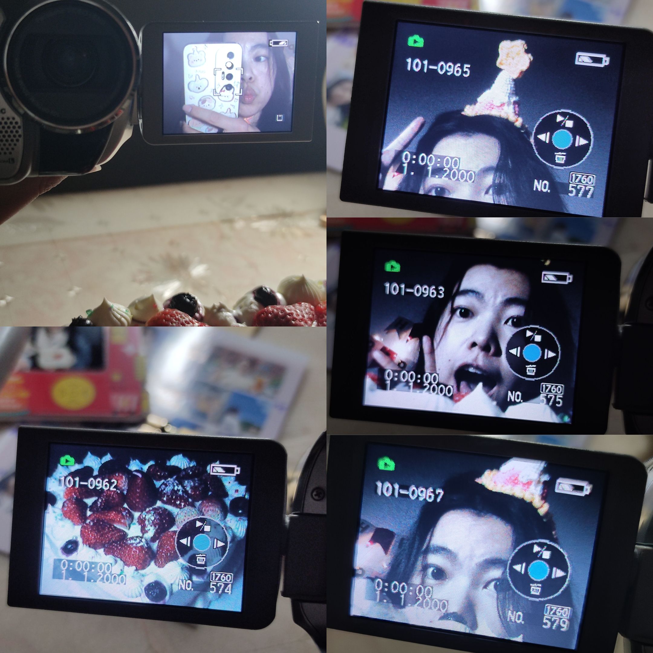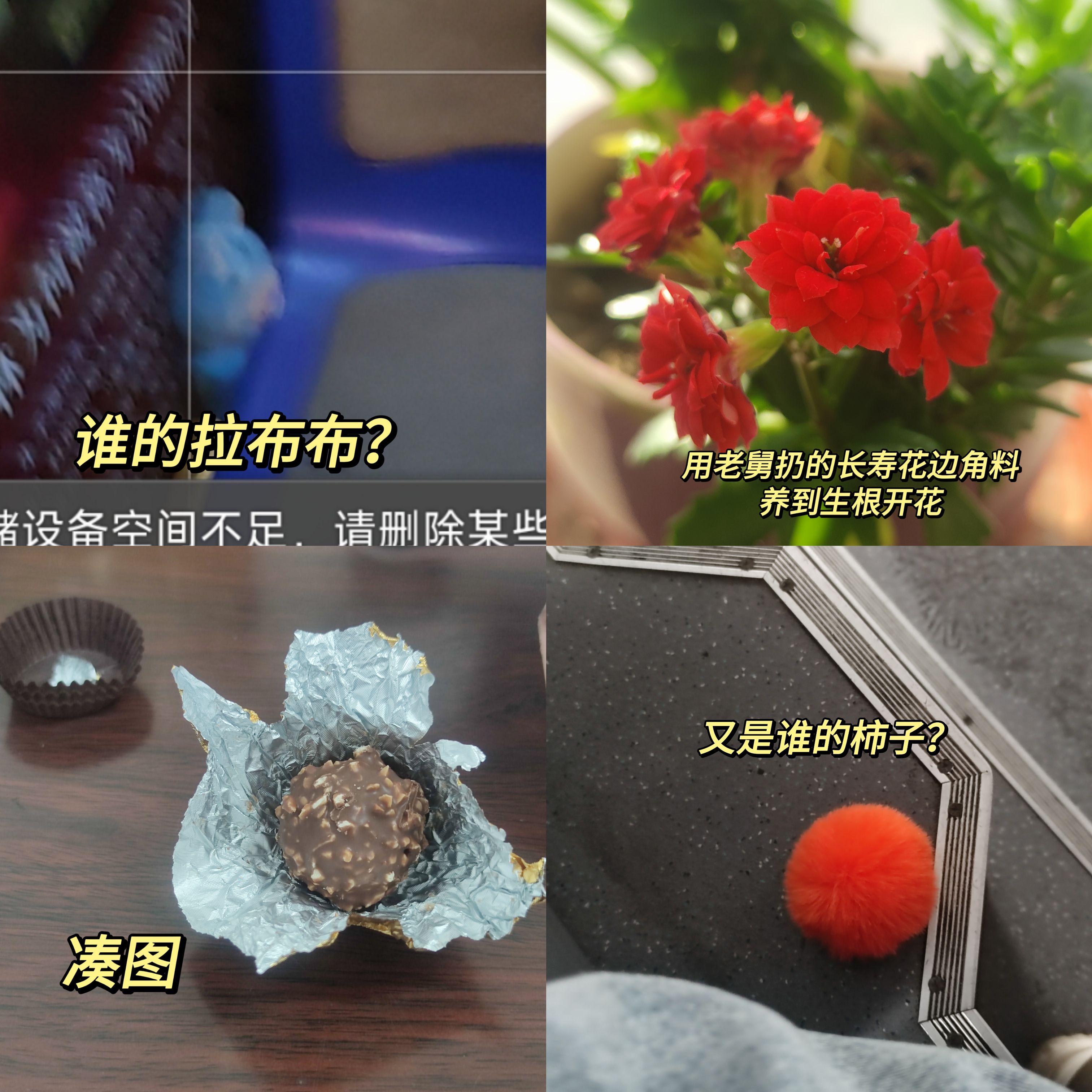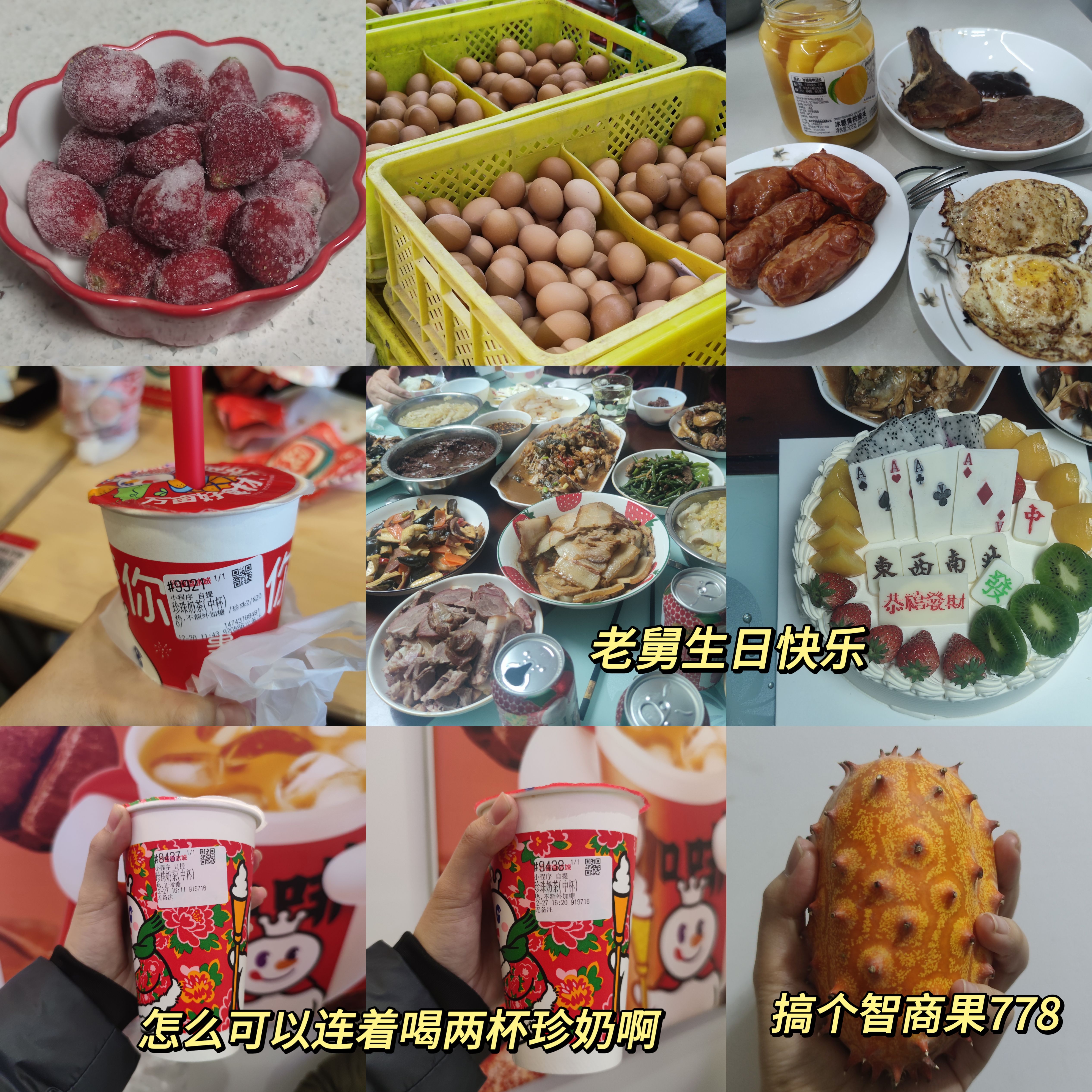 (道具如下:a. 生日蛋糕;b. 生日拉旗+LED小串灯;c. 自己手搓的钩针生日帽;d. 妈妈吹的气球;e. 好朋友送的生日礼物;f. 公历生日买的花;g. 过去一岁不同月份照片做的大头贴;h. 写着生日快乐的冰箱贴;i. 打火机;j. 手机支架;k. 补光灯+移动电源;l. 今年公历和农历生日两天的日期邮戳)(1月30日的其中一个邮戳是自己亲手敲的。)