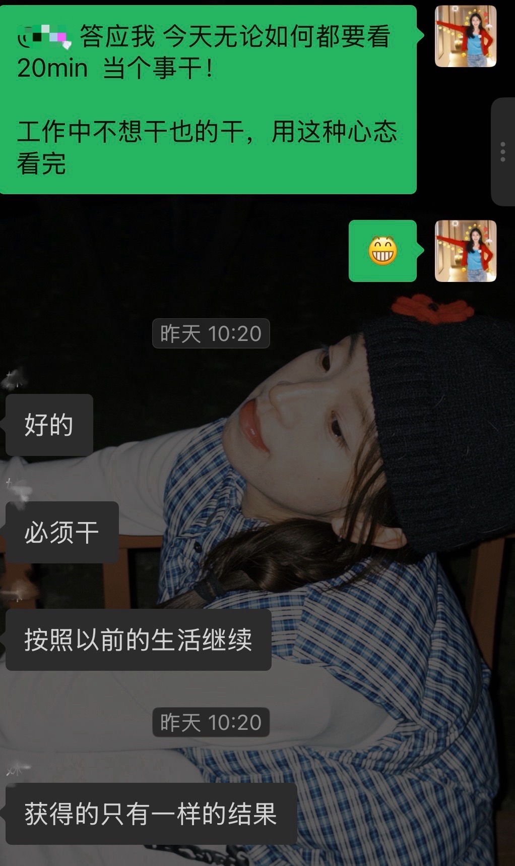 始终相信自己的直觉,让自己感觉到不舒适的人立马离开、让自己感受到不舒适的事情立马觉察,不舒适也许意味着内在的边界已经被冒犯,需要奋起反抗。