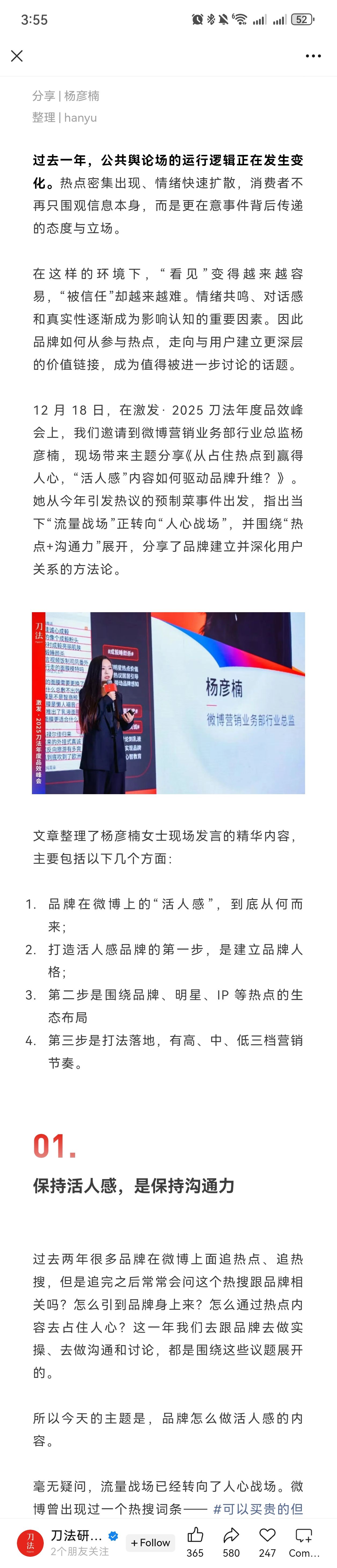 2025年刀法峰会现场,微博营销业务部行业总监杨彦楠现场带来分享,用具体实操案例拆解营销进化方法论。