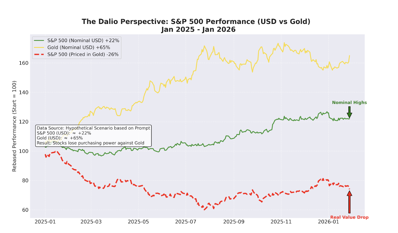 红色虚线(美股-黄金计价):这是Dalio所指的真实价值。当你剥离掉美元贬值的因素,用硬通货(黄金)重新衡量美股时,你会发现这条线是一路向下的(跌幅约 26%)。