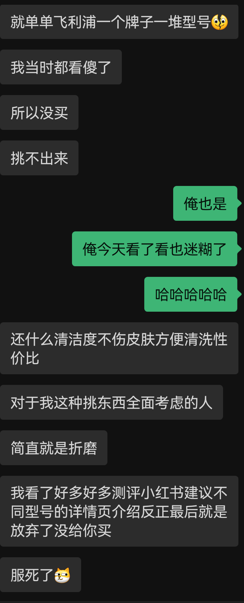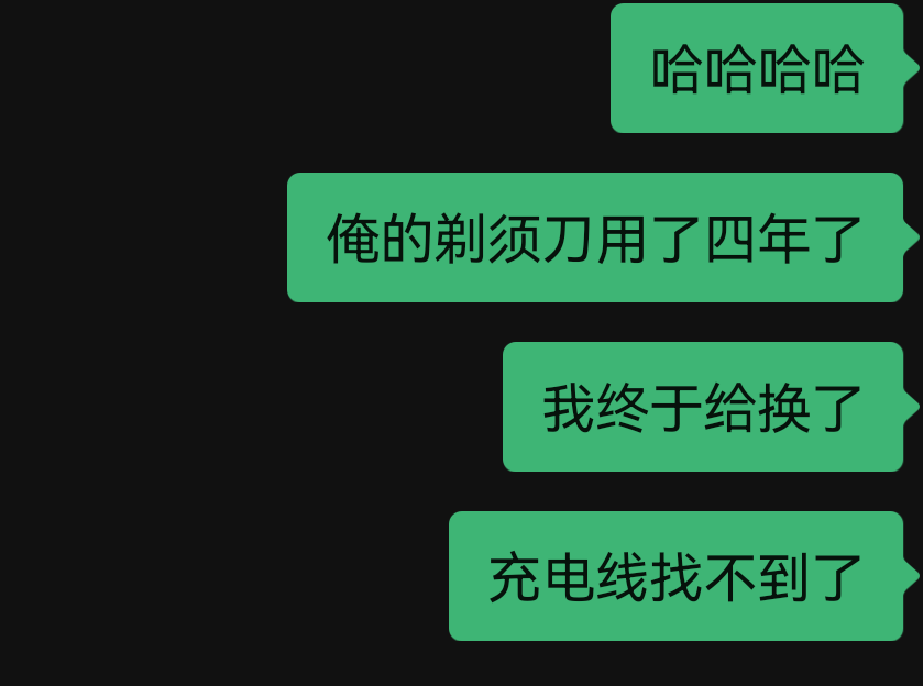 最近发生一件事,我的剃须刀用了四年了,那天充电线找不到了,于是我在京东下单一个几十块钱的一个剃须刀,我就给她分享了一下这件事,她的回答有点让我印象深刻,如下图,大概就是说她原本想送我一个,而且她了解过,但是详细了解这种产品有点难,不知道我喜欢哪种,就放弃送我了。