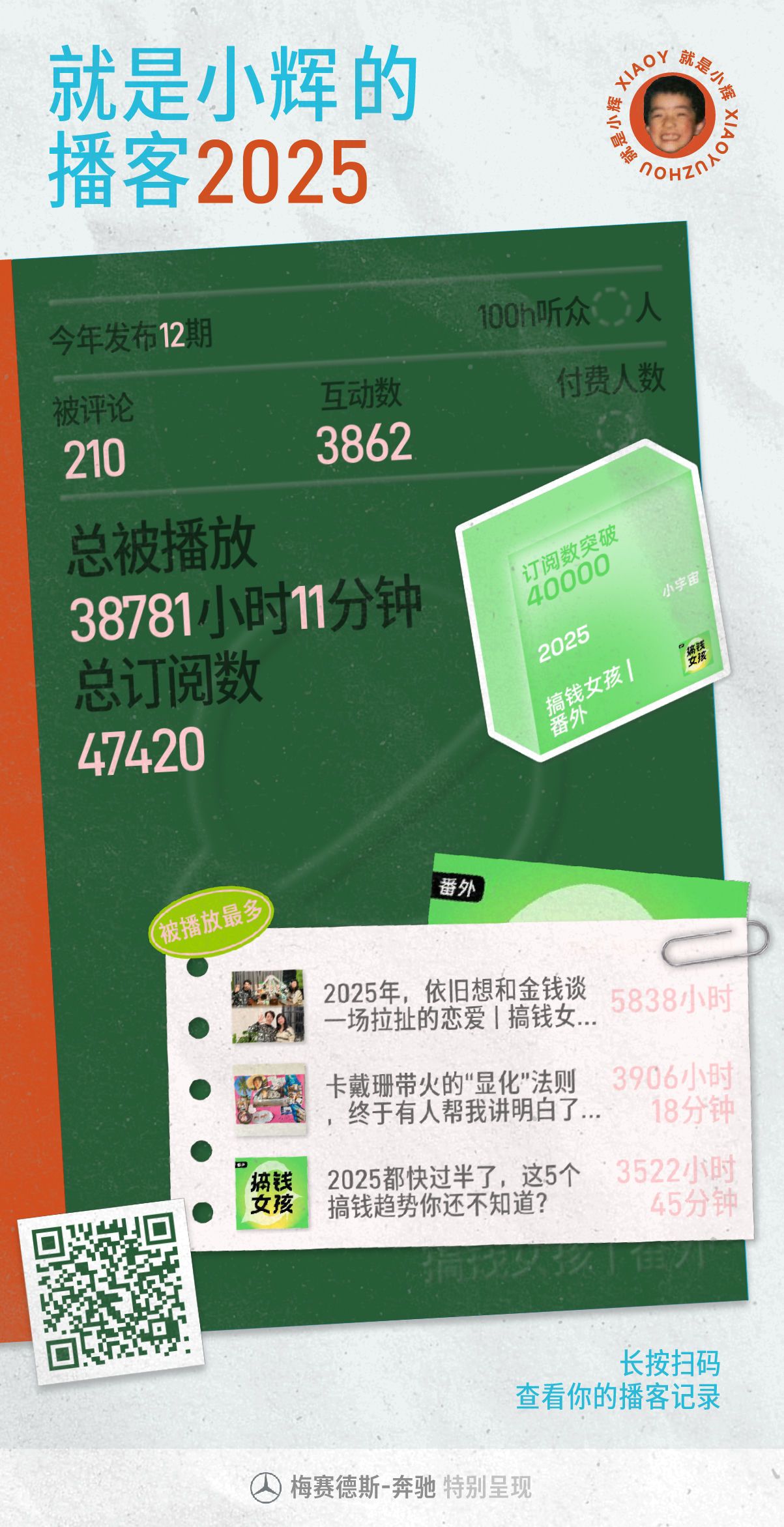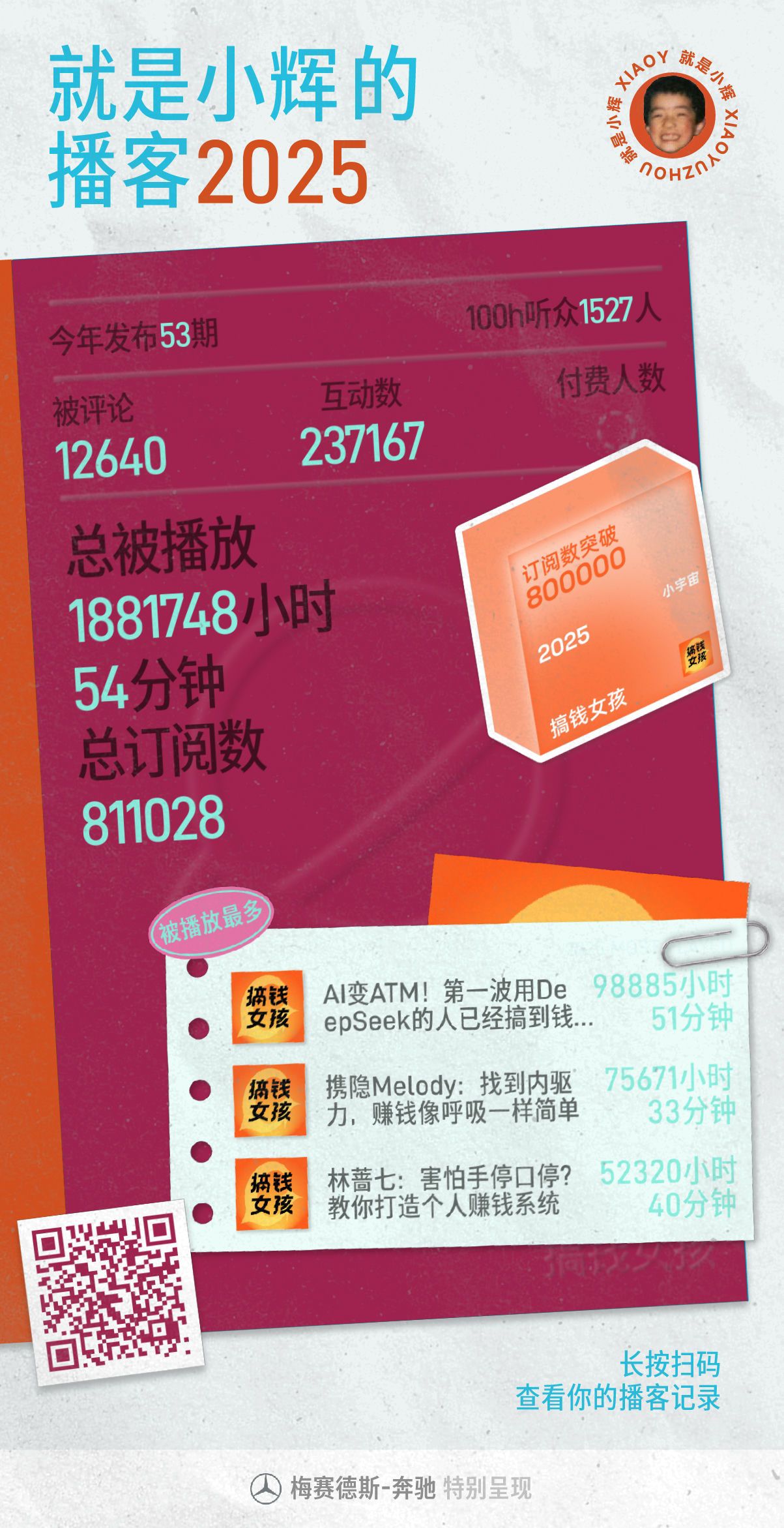 感谢播客,这可能是如今快节奏时代最有【时间质感】的媒体了。2025年,我们在《搞钱女孩》播客里听到了A股牛市、AI浪潮、自媒体红利、消费趋势等宏大叙事,也走近了更多勇敢且坚韧的真实个体,有教培亏钱转型做跨境主播的宝妈、有大厂离职靠一人年入百万的纹眉师、有副业做退休俱乐部的综艺节目制作人、有建筑系转收纳师月入5W的00后……我们又用一年的时间,刻画了一组当代中国女性的多元群像。