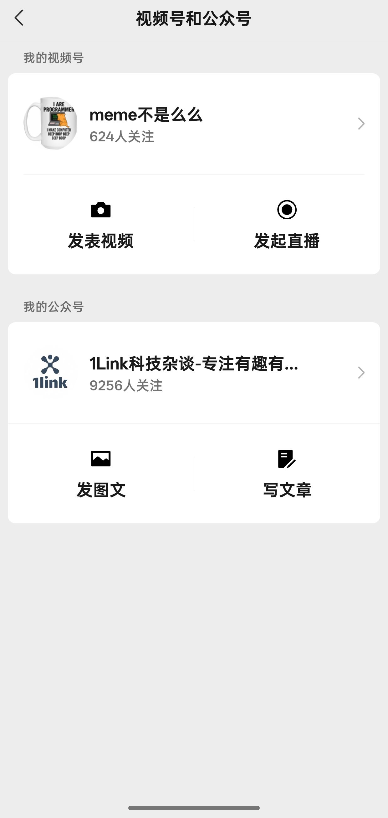 公众号新增入口,微信~我~视频号升级为视频号和公众号,点击之后可以操作公众号发表图文和写文章