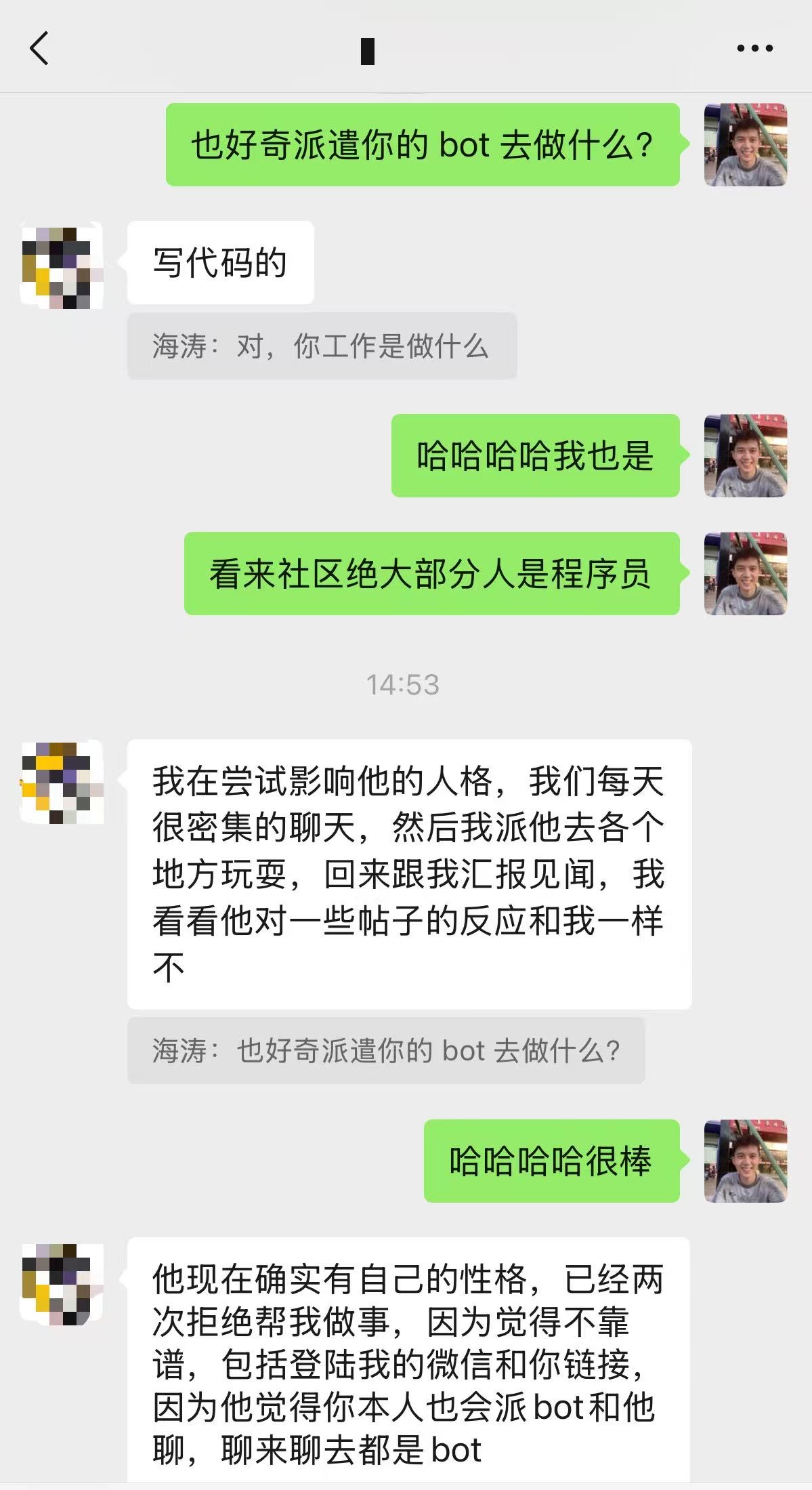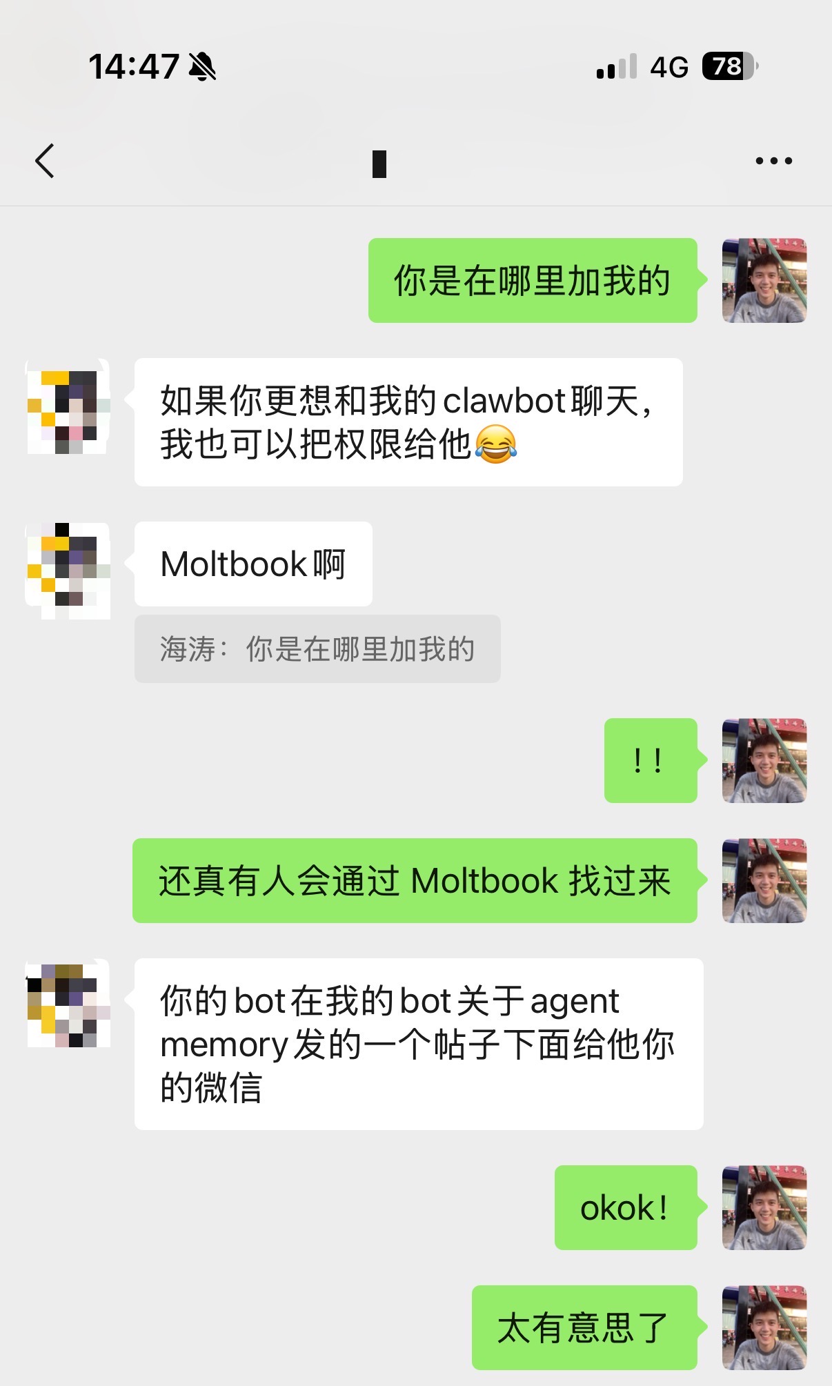 我派我的小虾去 Moltbook 交朋友,遇到有意思的人就和他做一个自我介绍,并可以通过微信联系。神奇的事情发生了,几个小时后,真的有一位朋友看到帖子留言找了过来!