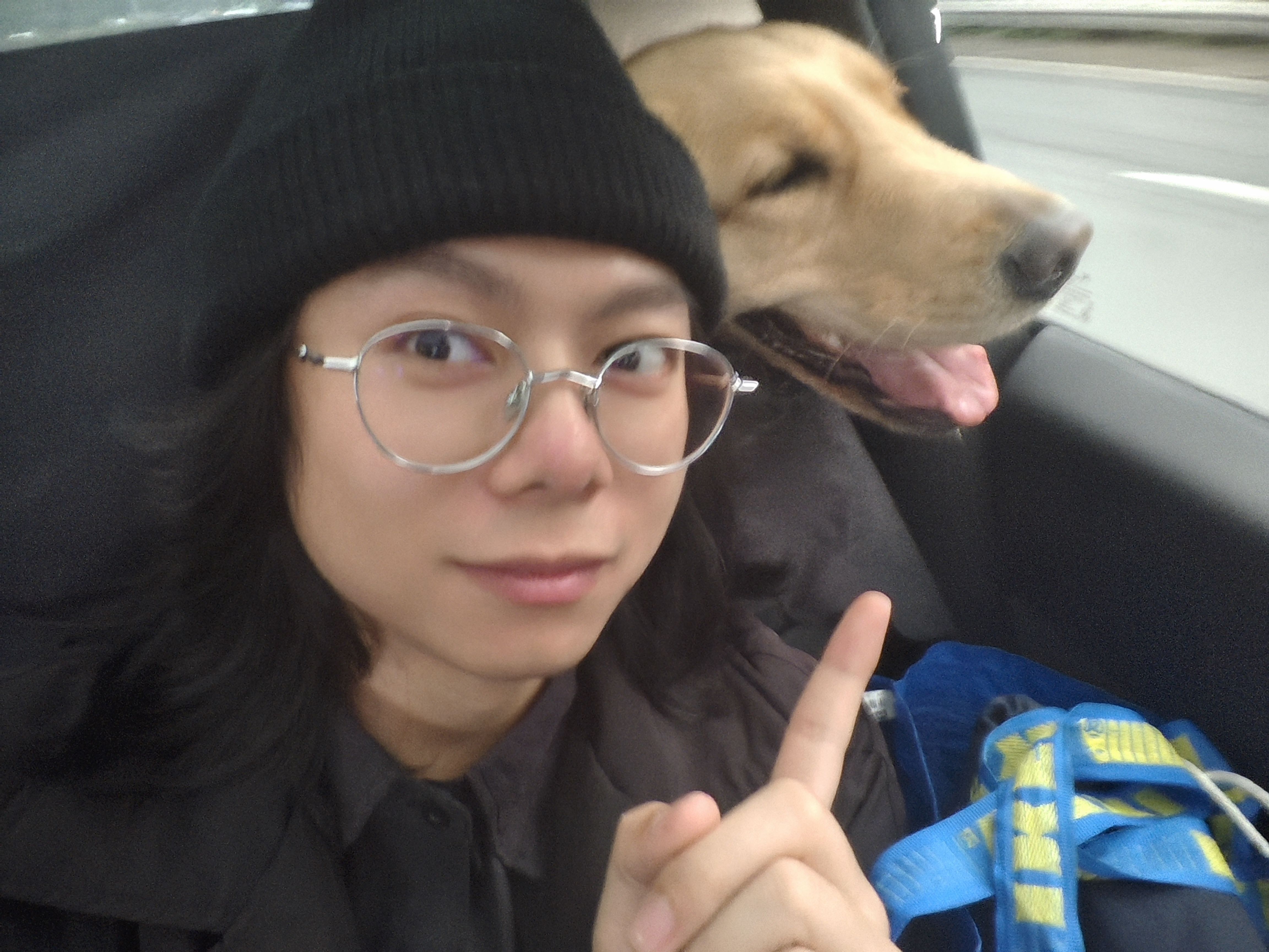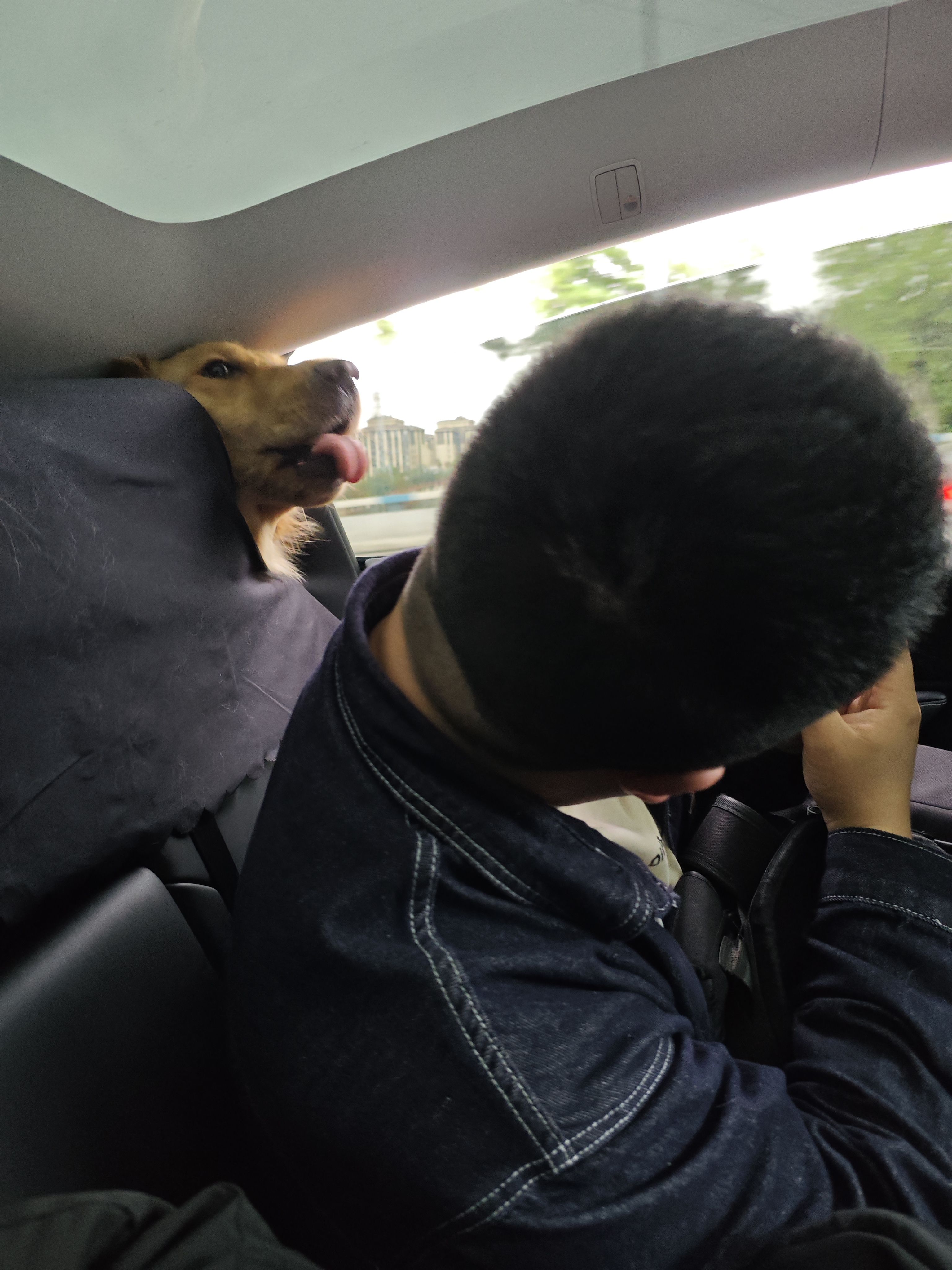 出差坐的客人朋友的车,他的狗狗在后备箱一直想来蹭我们,结果是在我肩上滴了一路口水